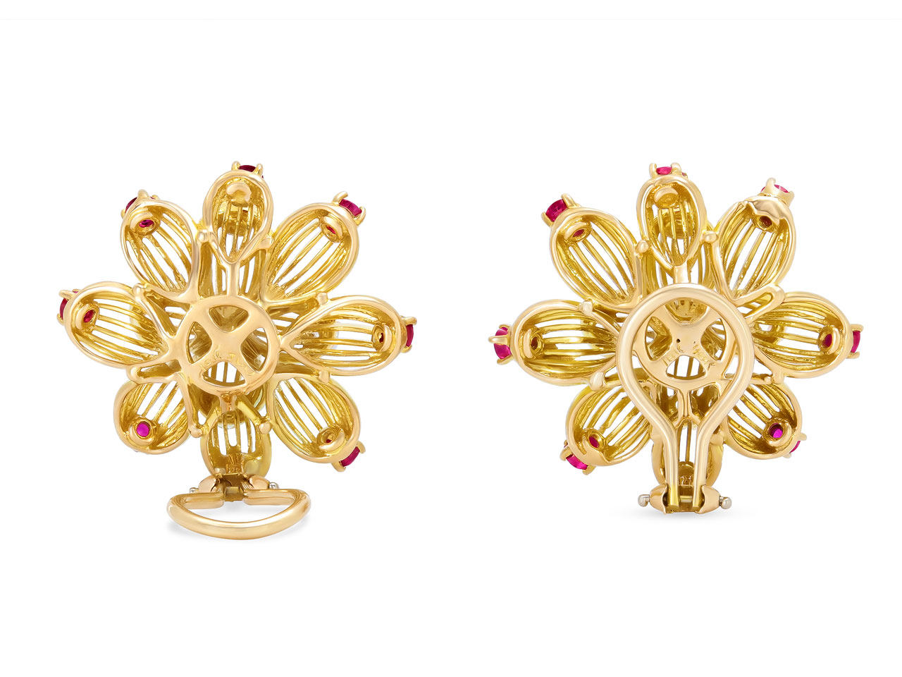 Each of bulbous floral motif, the oval ruby pistil extending to wire-frame petals terminating in round diamond and rubies, in 18k gold. With omega backs.