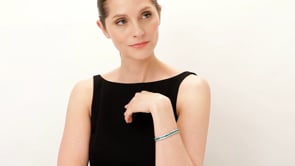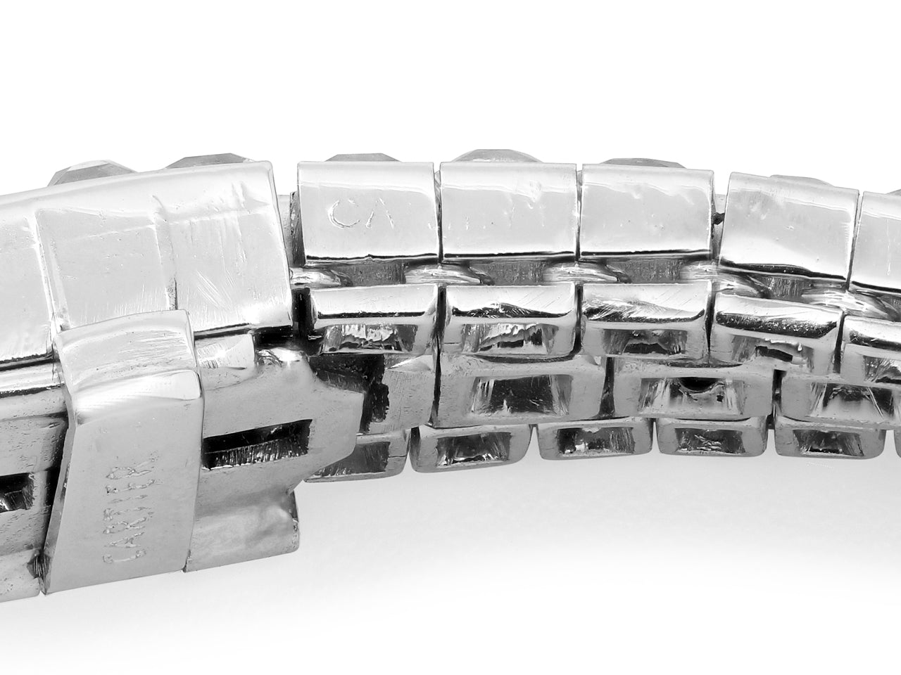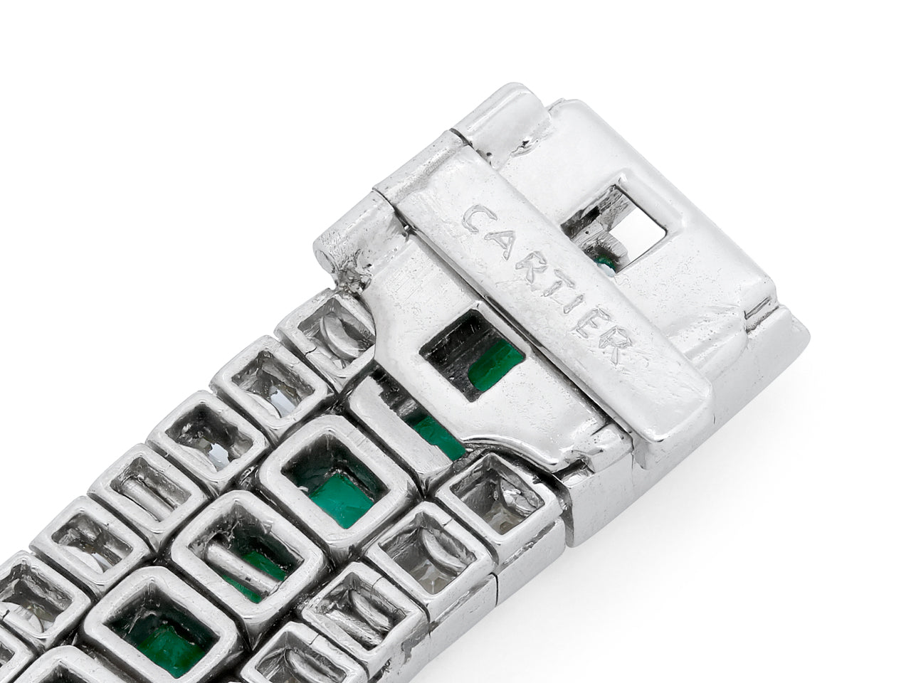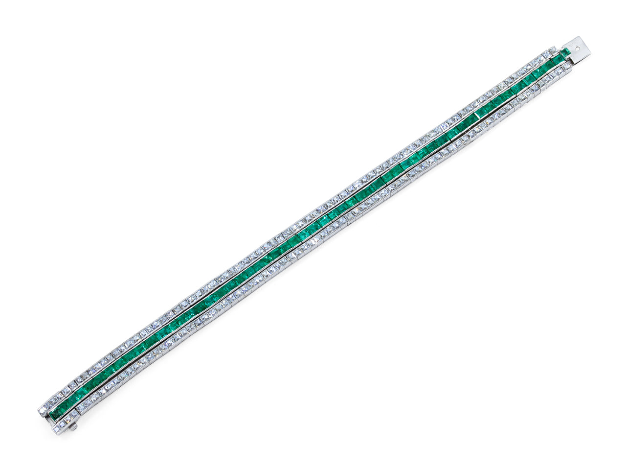 Comprising a channel-set emerald bracelet with 54 platinum links, flanked by two French-cut diamond bracelets, each with 78 platinum links.