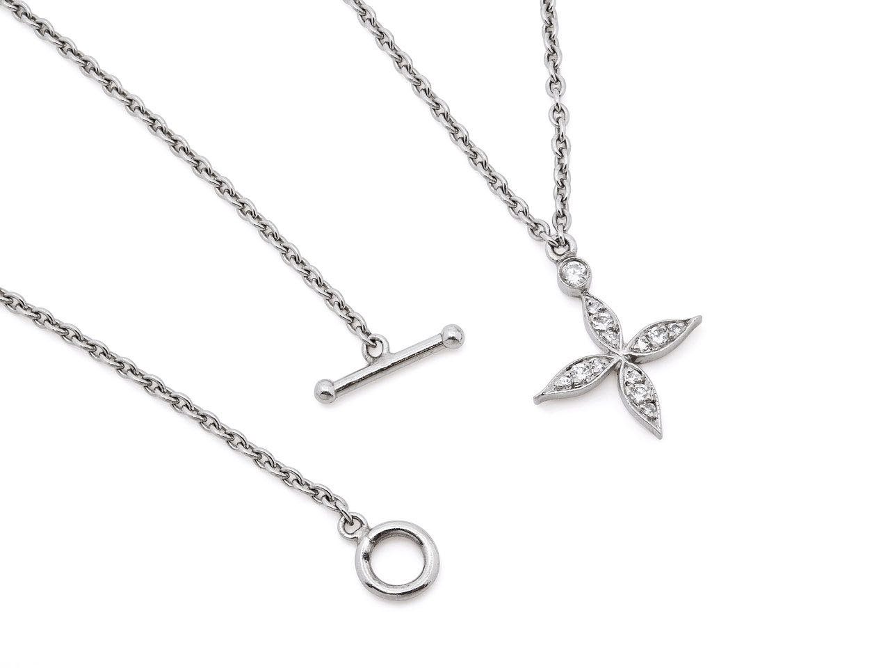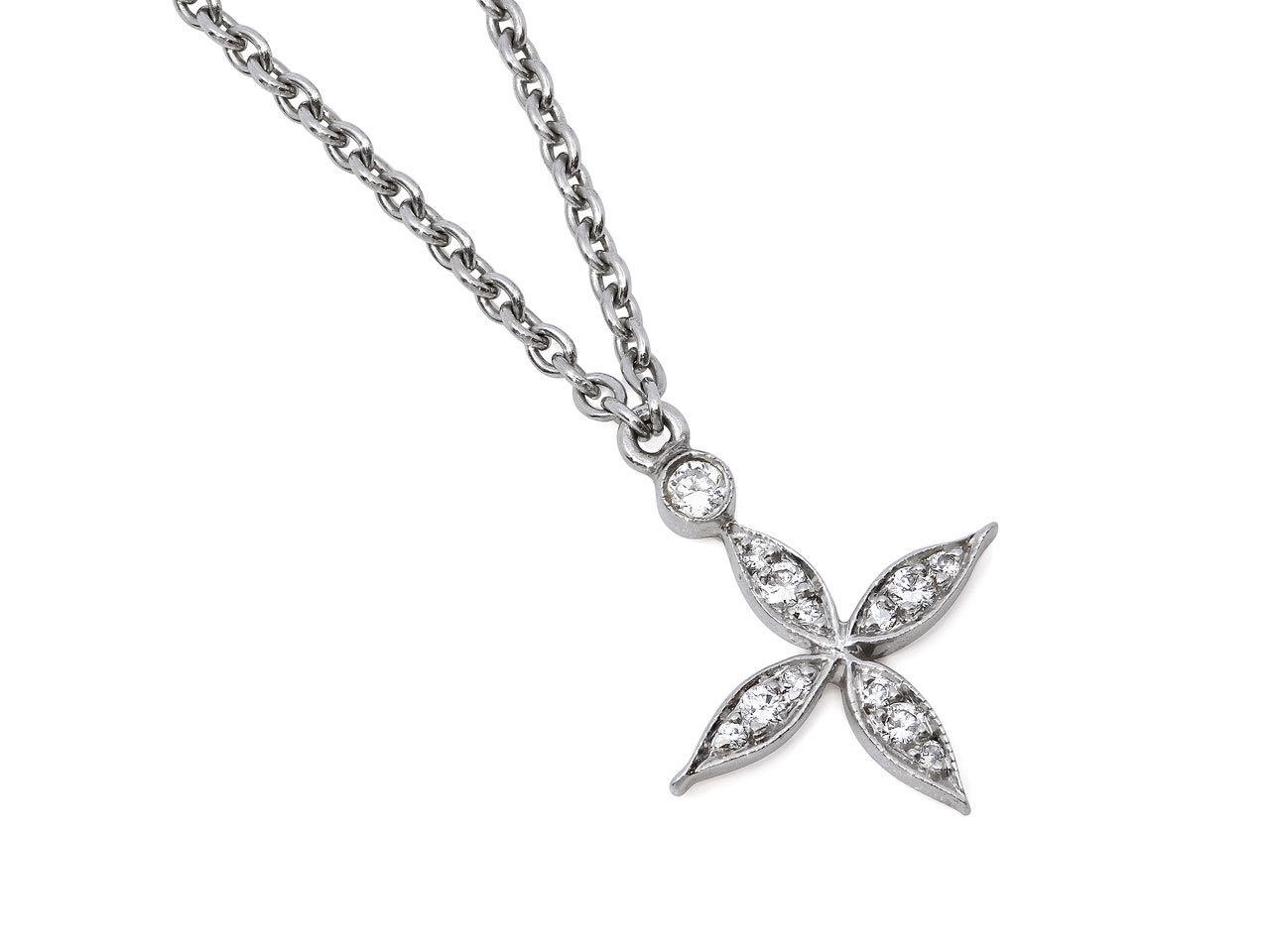 Designed as a delicate four-petaled flower, each petal set with a trio of diamonds, from a fine link chain with a toggle clasp, all in platinum.