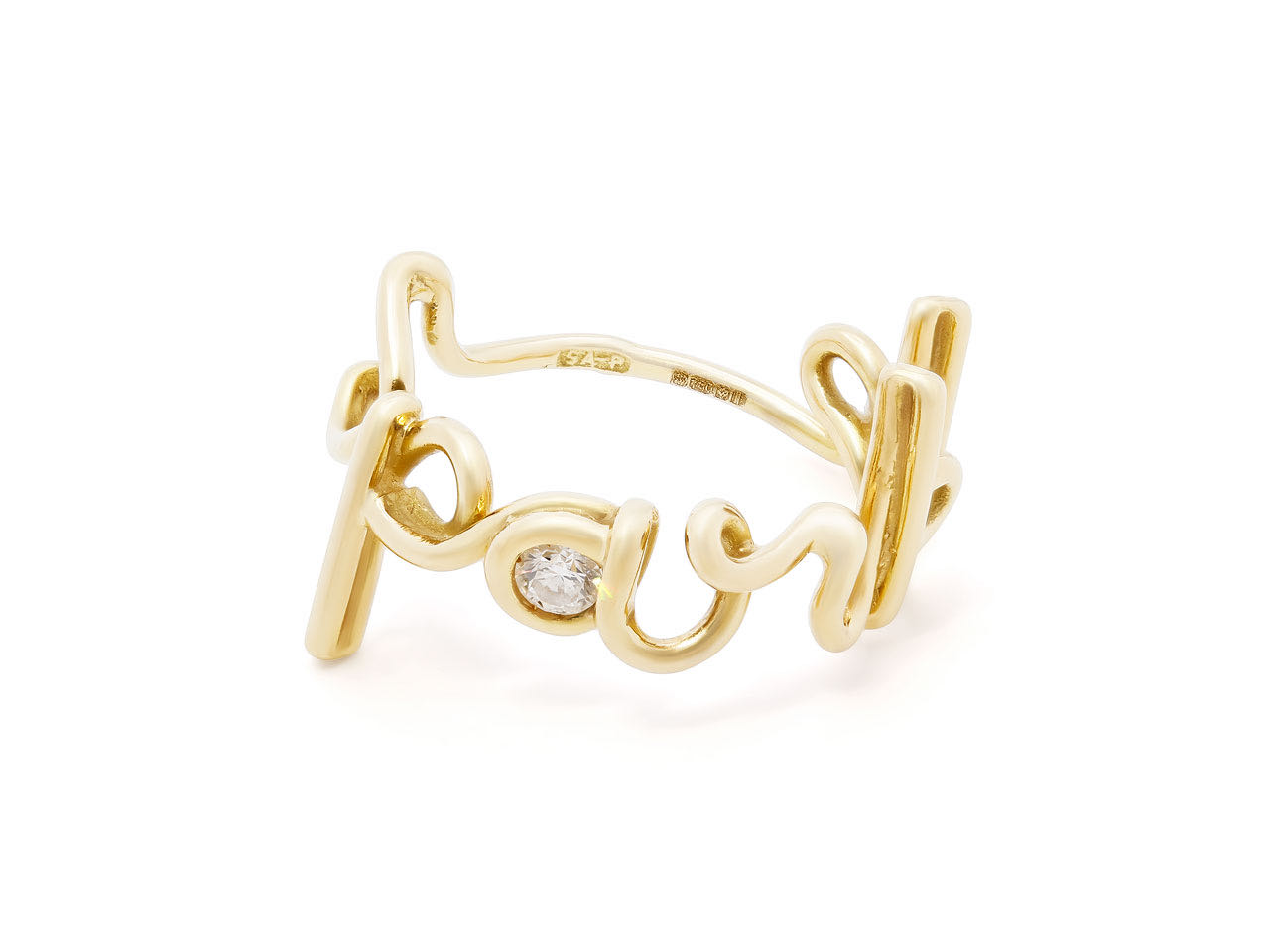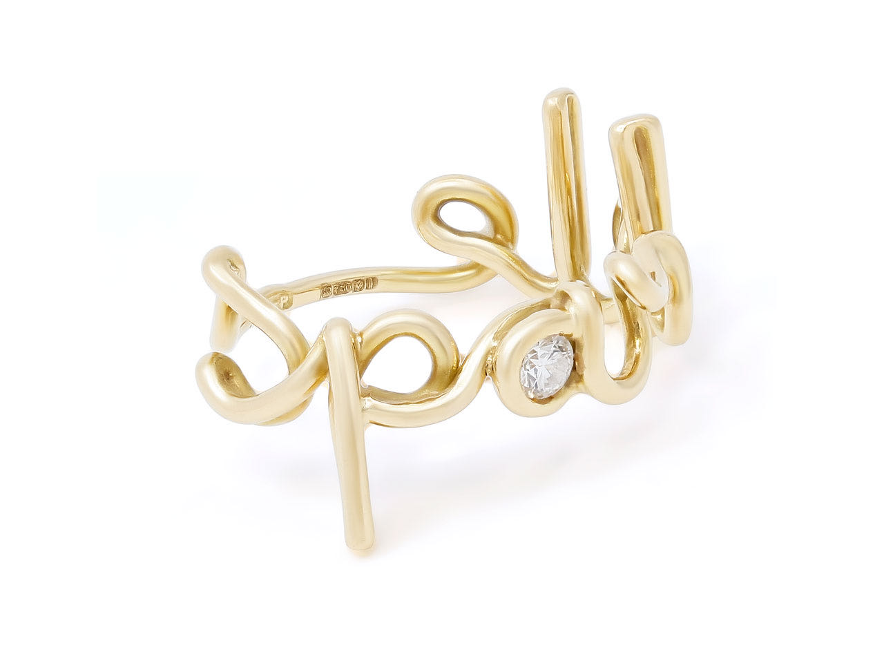 The thick gold wire spelling the word "Sparkle, accented by a single diamond set in the letter "a", in 18k gold. Signed SA-P for Solange Azagury-Partridge.