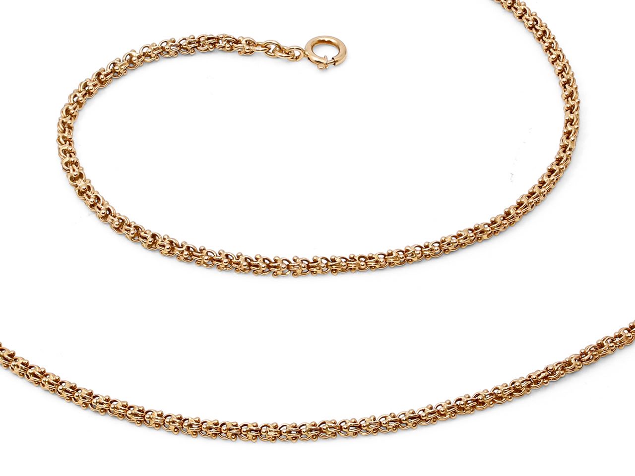 The foxlink chain tassel with taille d'épargne black enamel decorated crown, accented with gold foliate motifs, suspended from a long chain composed of fancy circular links with small bead detailing, all in 15k gold.