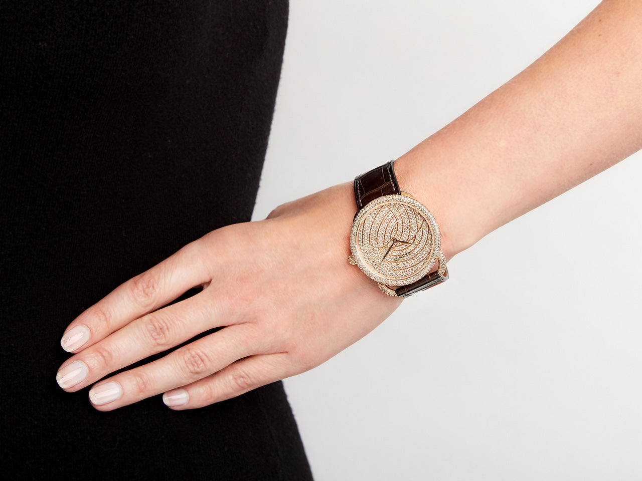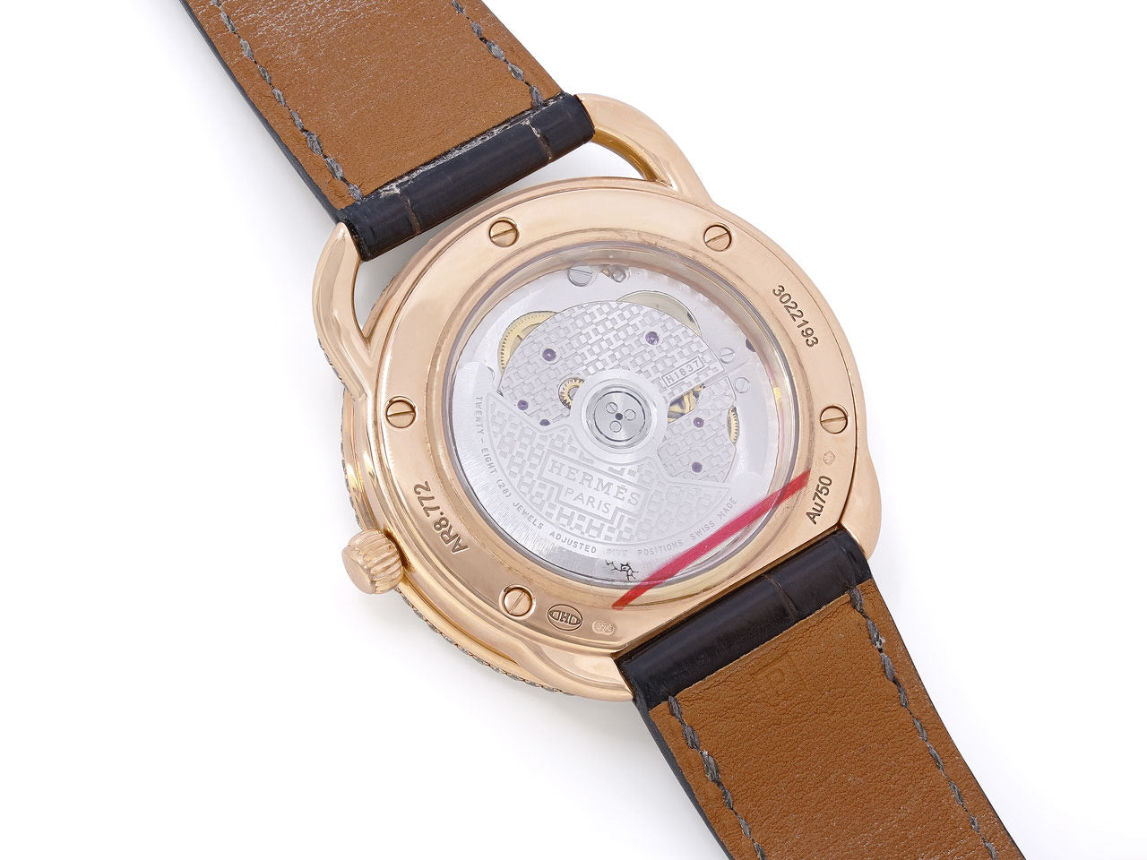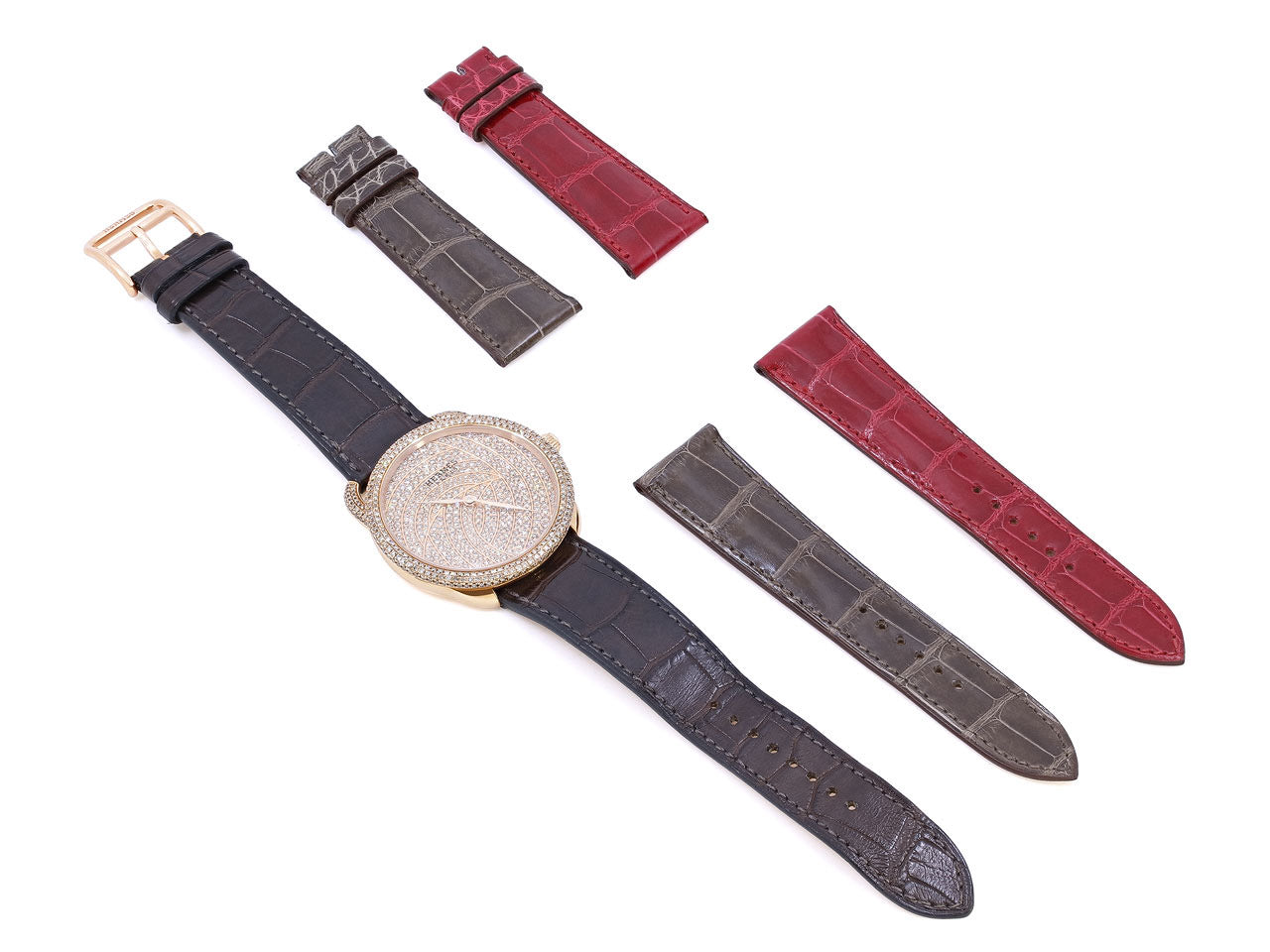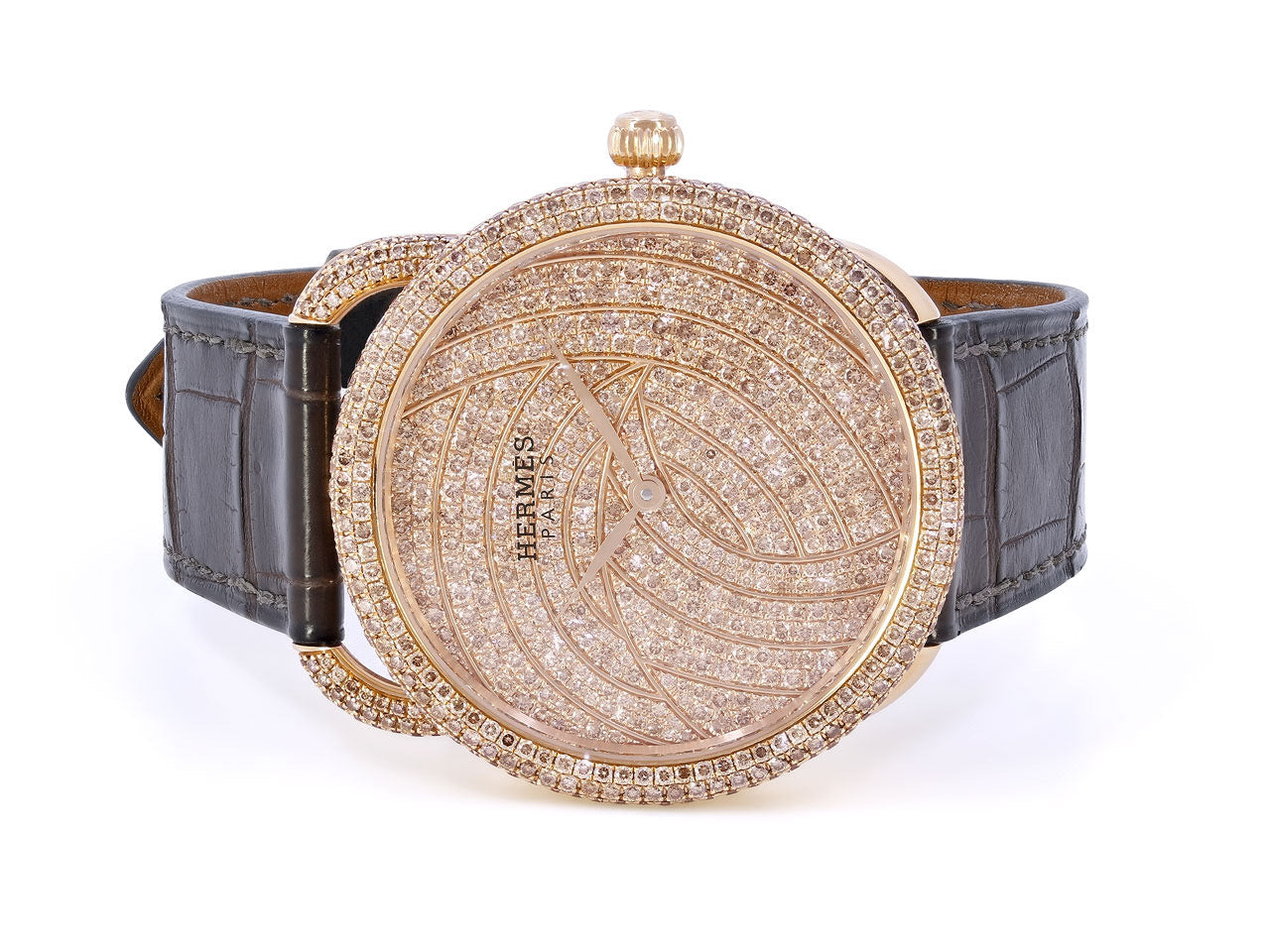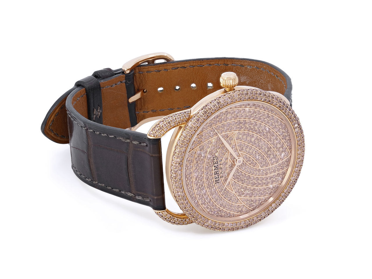 Circular dial and case set with brown diamonds in 18k rose gold, with an exhibition case back. Dial, case, movement, strap and buckle signed Hermès.