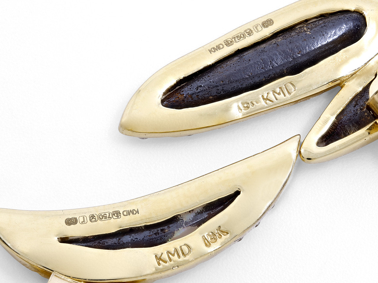 Each earring with a trio of white and blue opals, of various elongated shapes, surrounded by a halo of diamonds set in 18k gold. With posts, signed KMD for Kimberly McDonald, with English hallmarks.