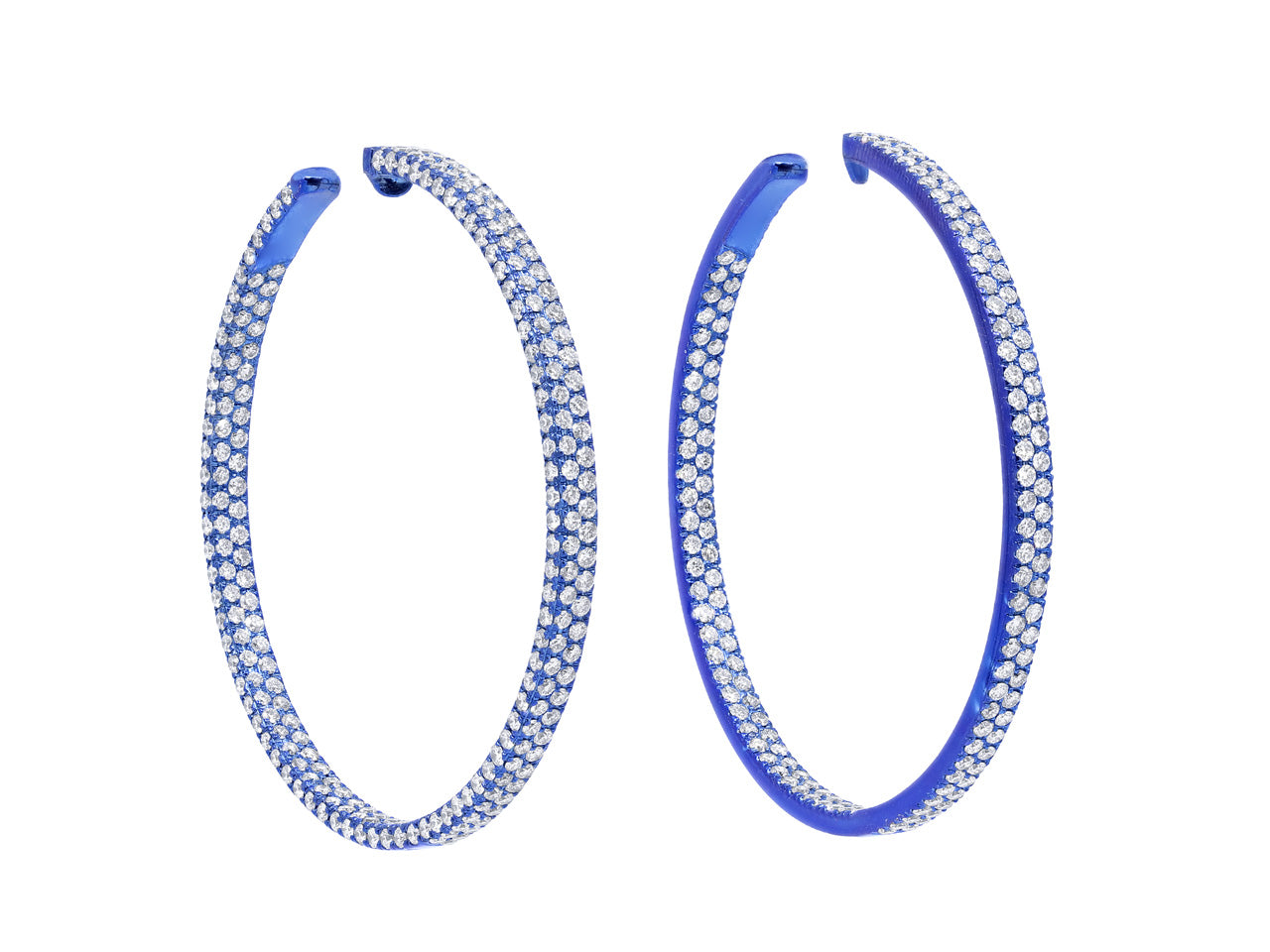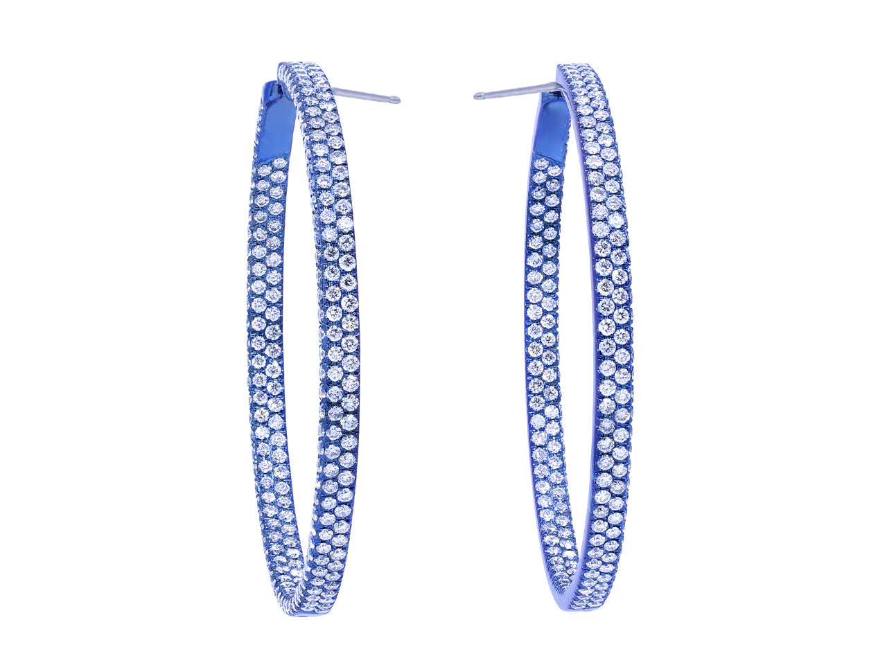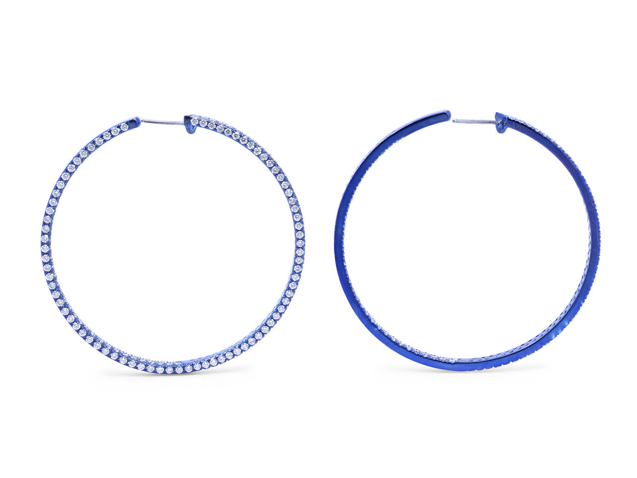 Light weight hoop earrings featuring pavé set diamonds in anodized blue titanium, with posts and 18k white gold friction backs.