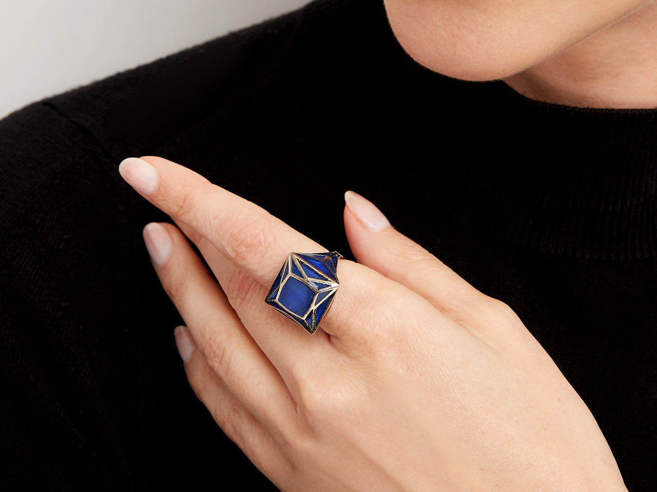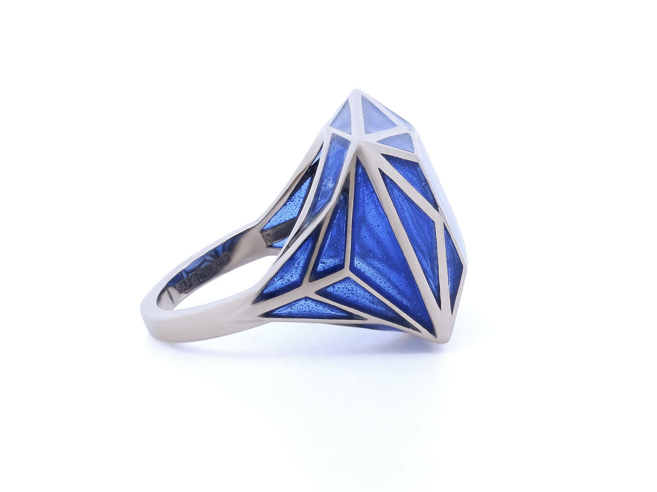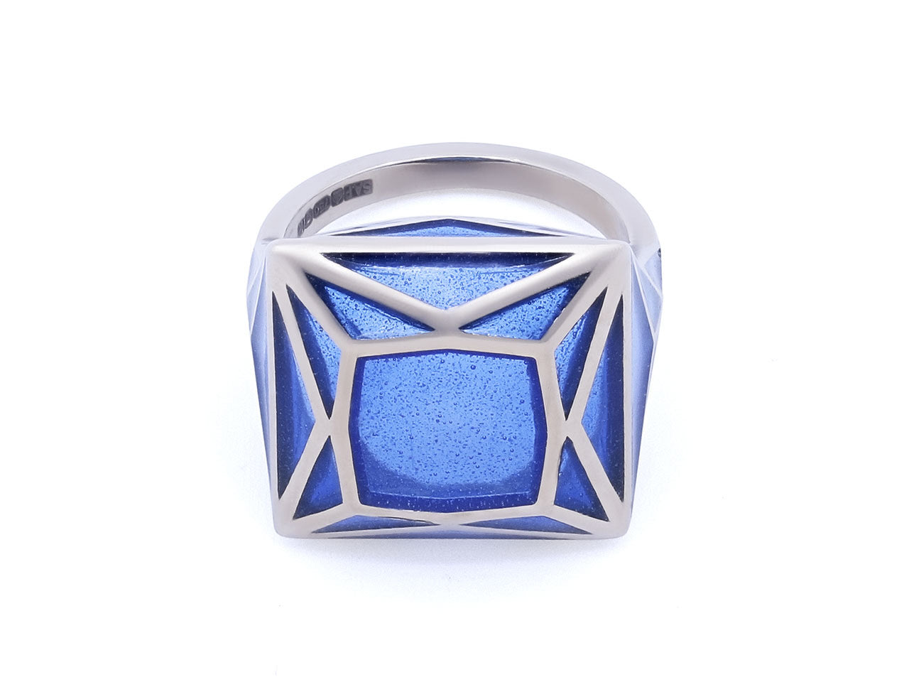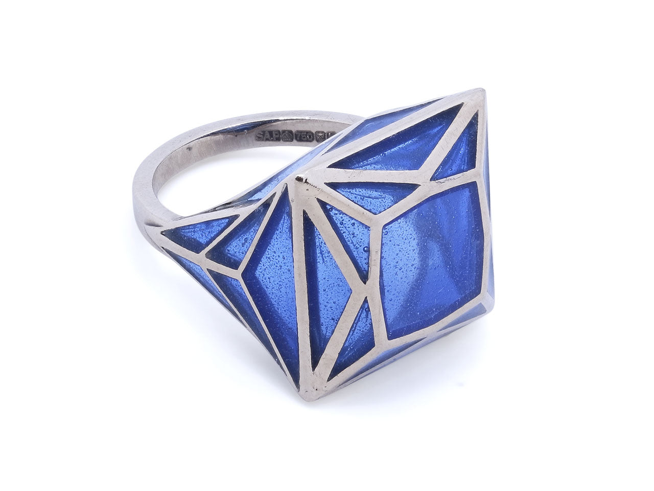 Blue plique-à-jour enamel ring in 18K white gold. Signed SA-P for Solange Azagury-Partridge, with English hallmarks.