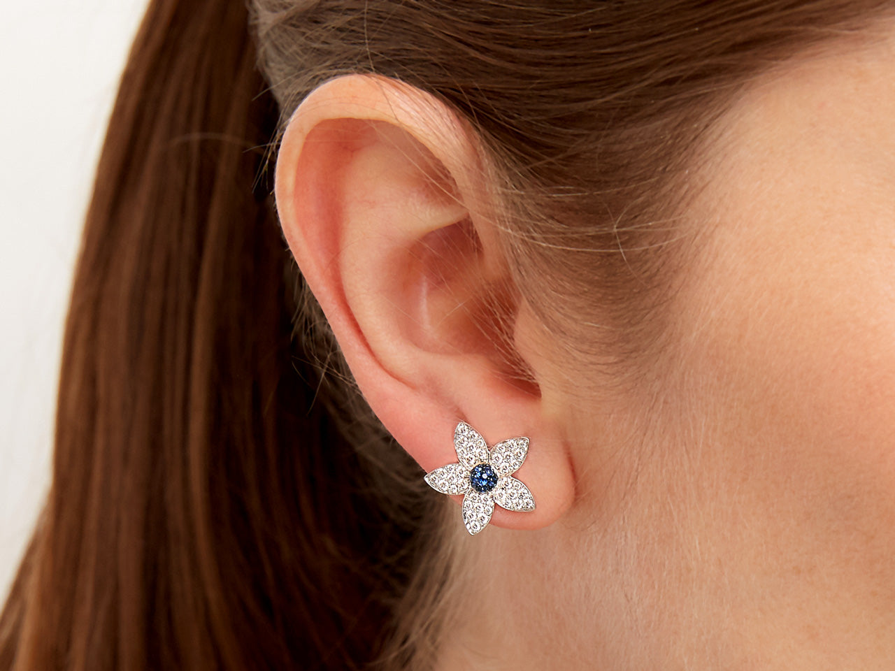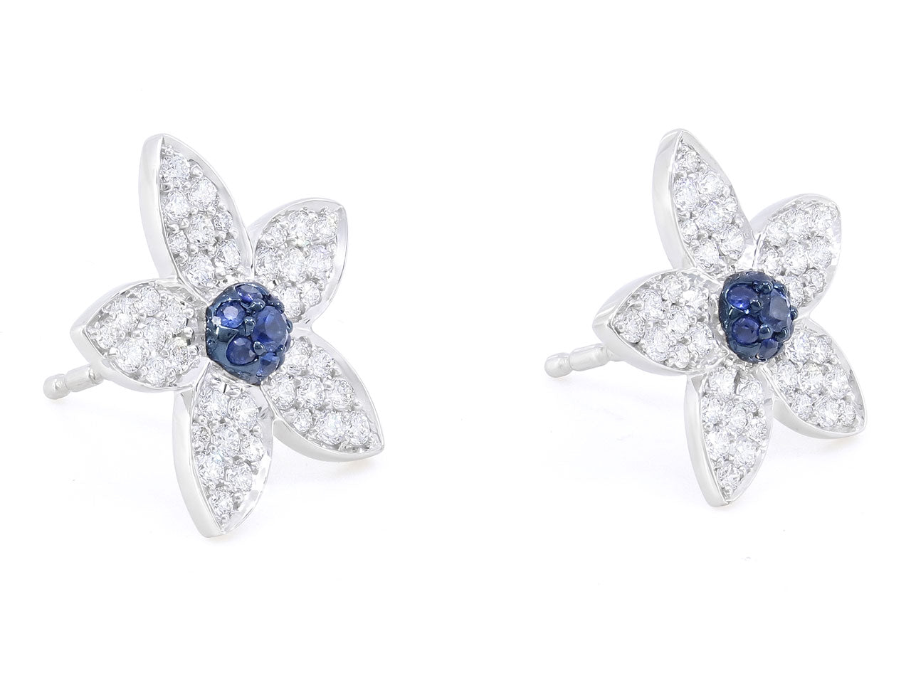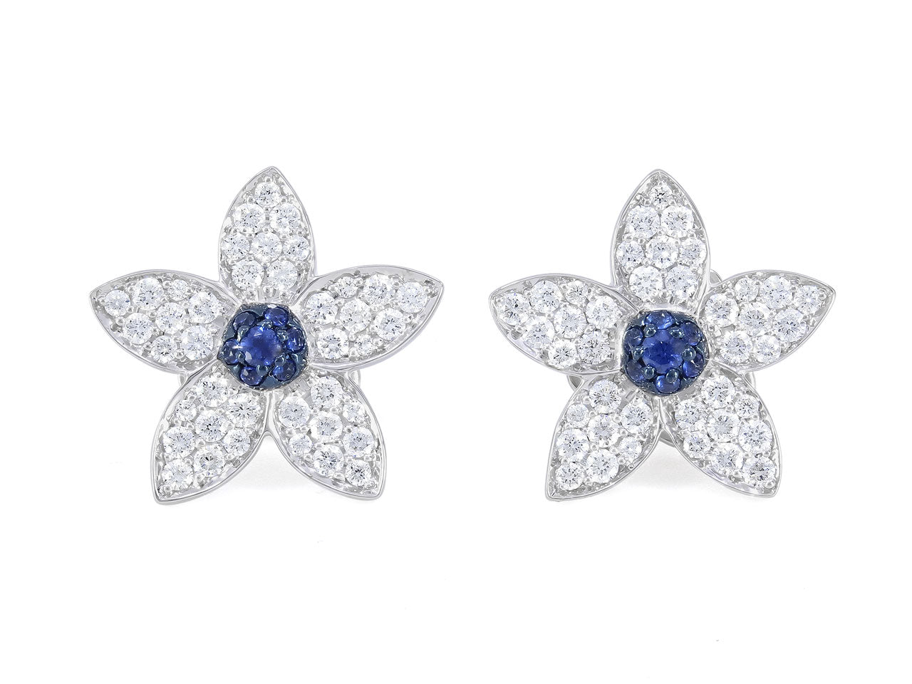 Earrings with a domed sapphire pistil extending to five pavé set diamond petals, in 18k white gold, with posts and push backs. Signed RFG for Rhonda Faber Green.