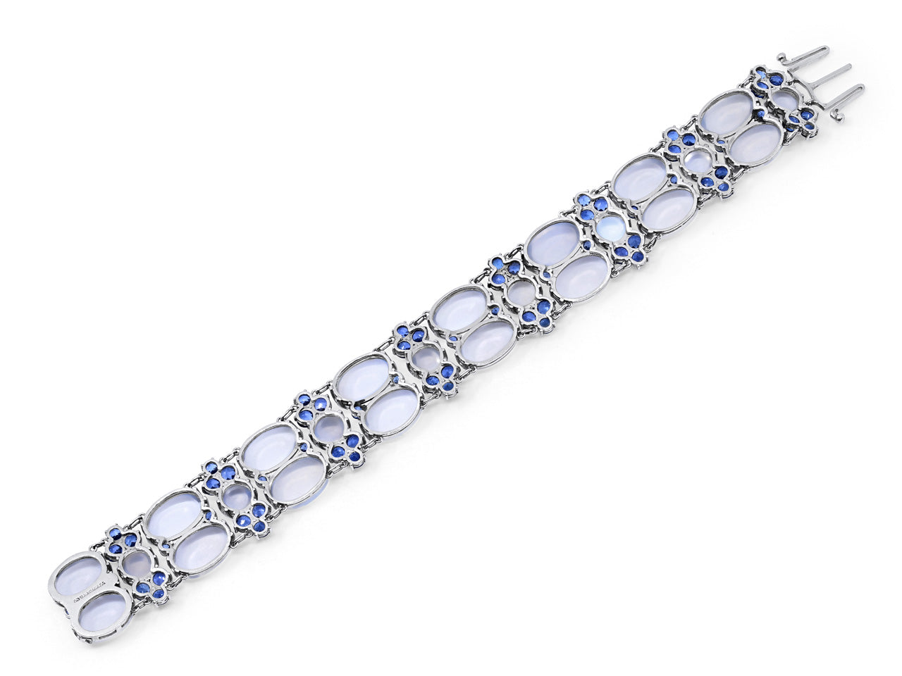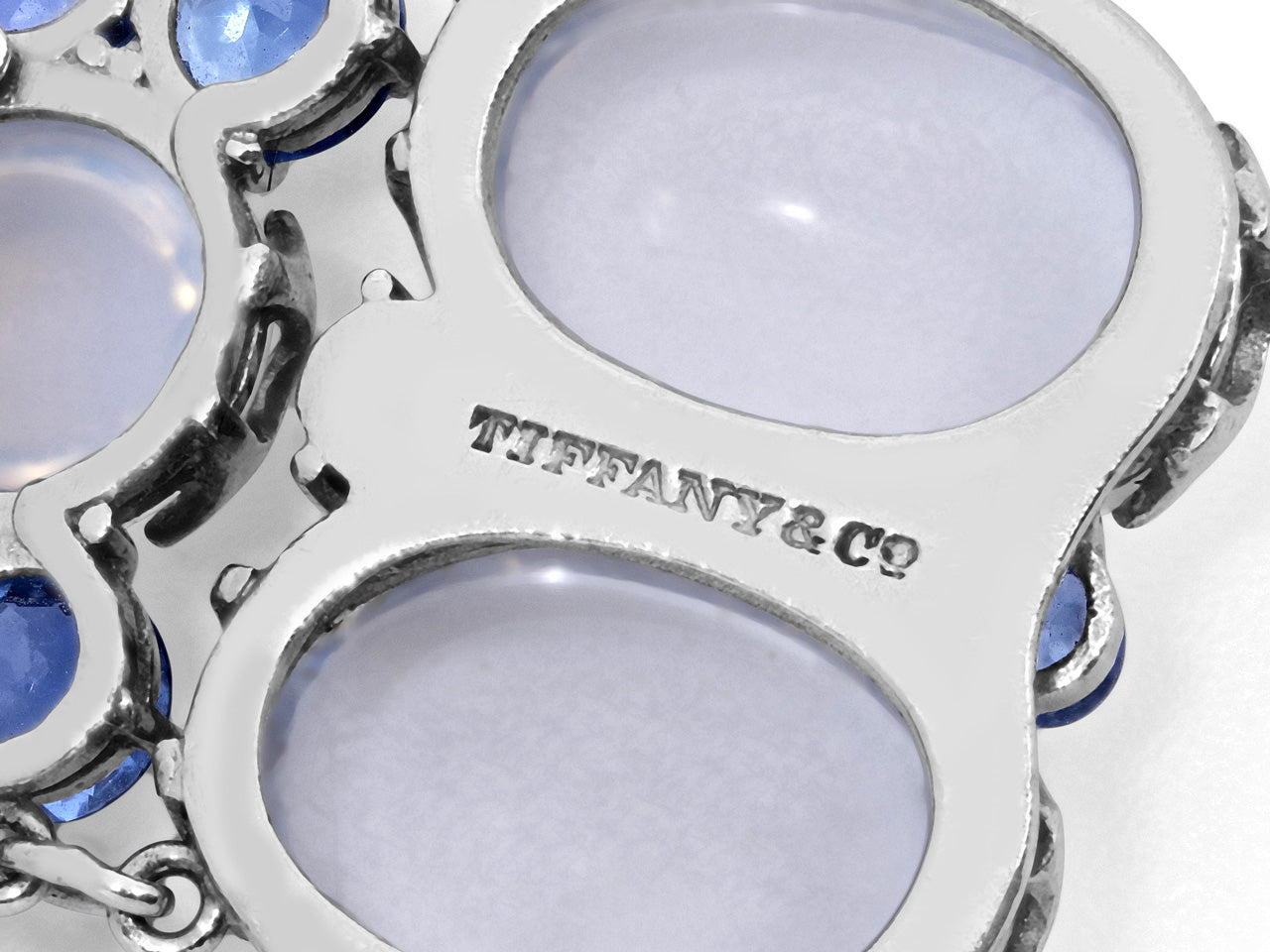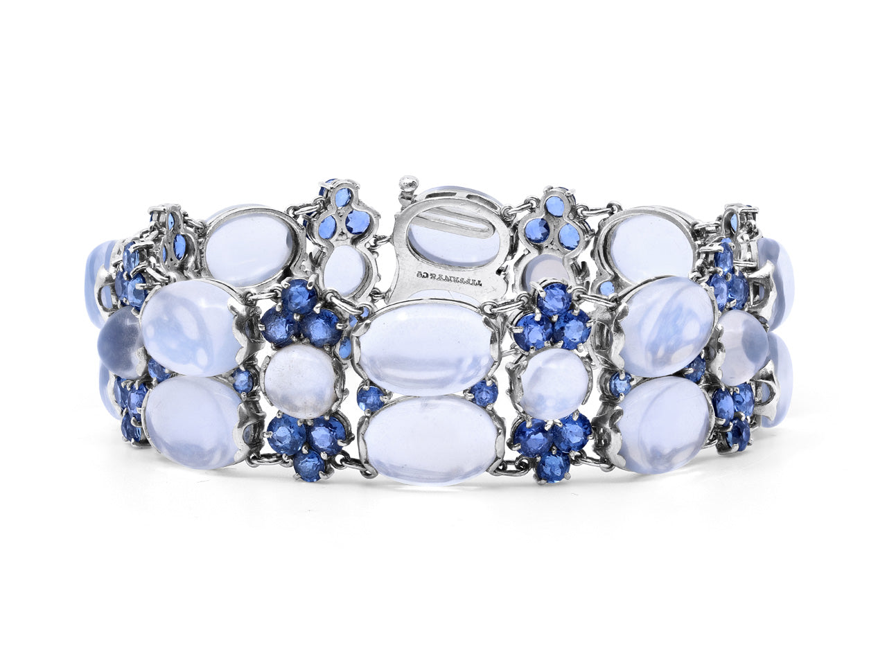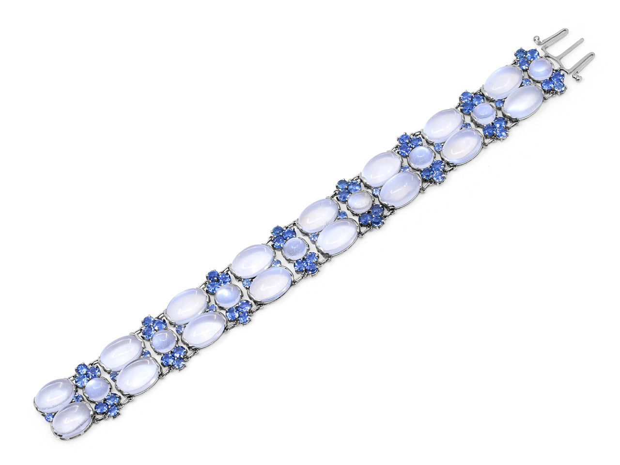 Featuring cabochon moonstones with blue adularescence, accented by clusters of sapphires, set in platinum, with a tongue clasp. Signed Tiffany & Co.