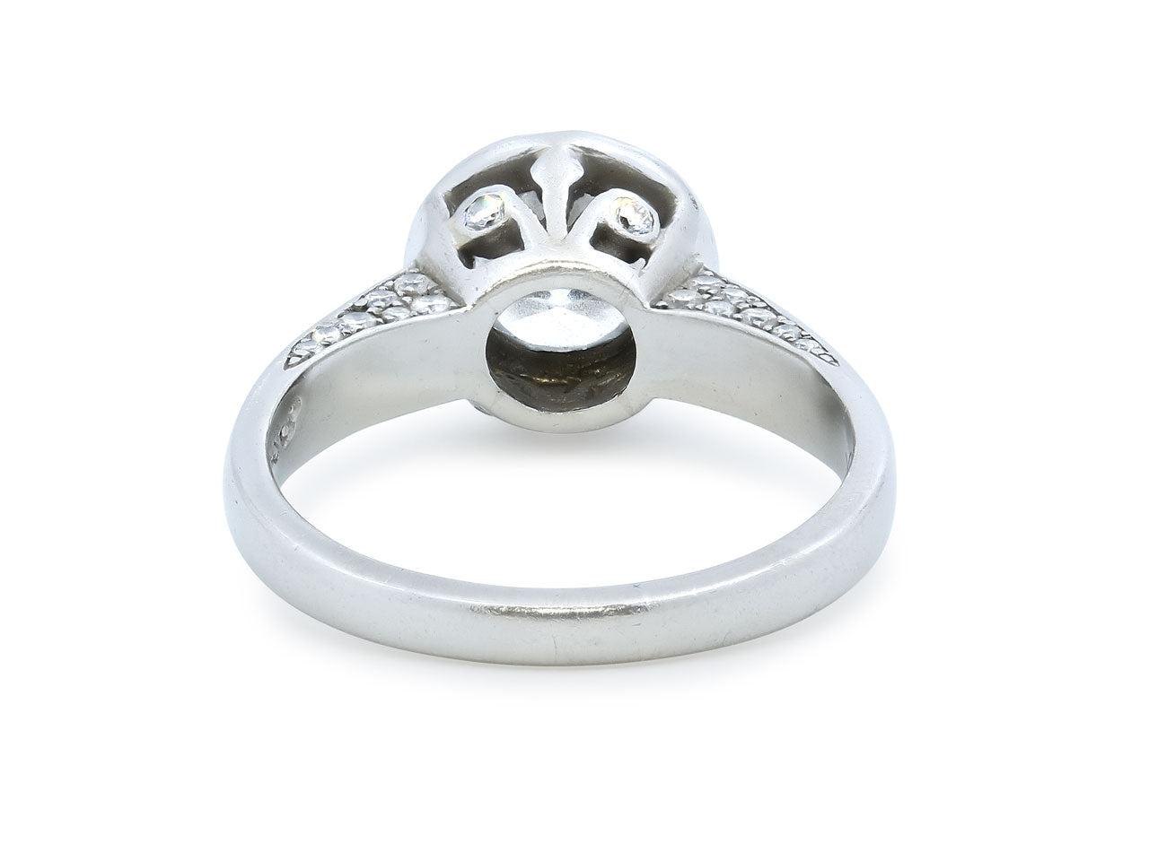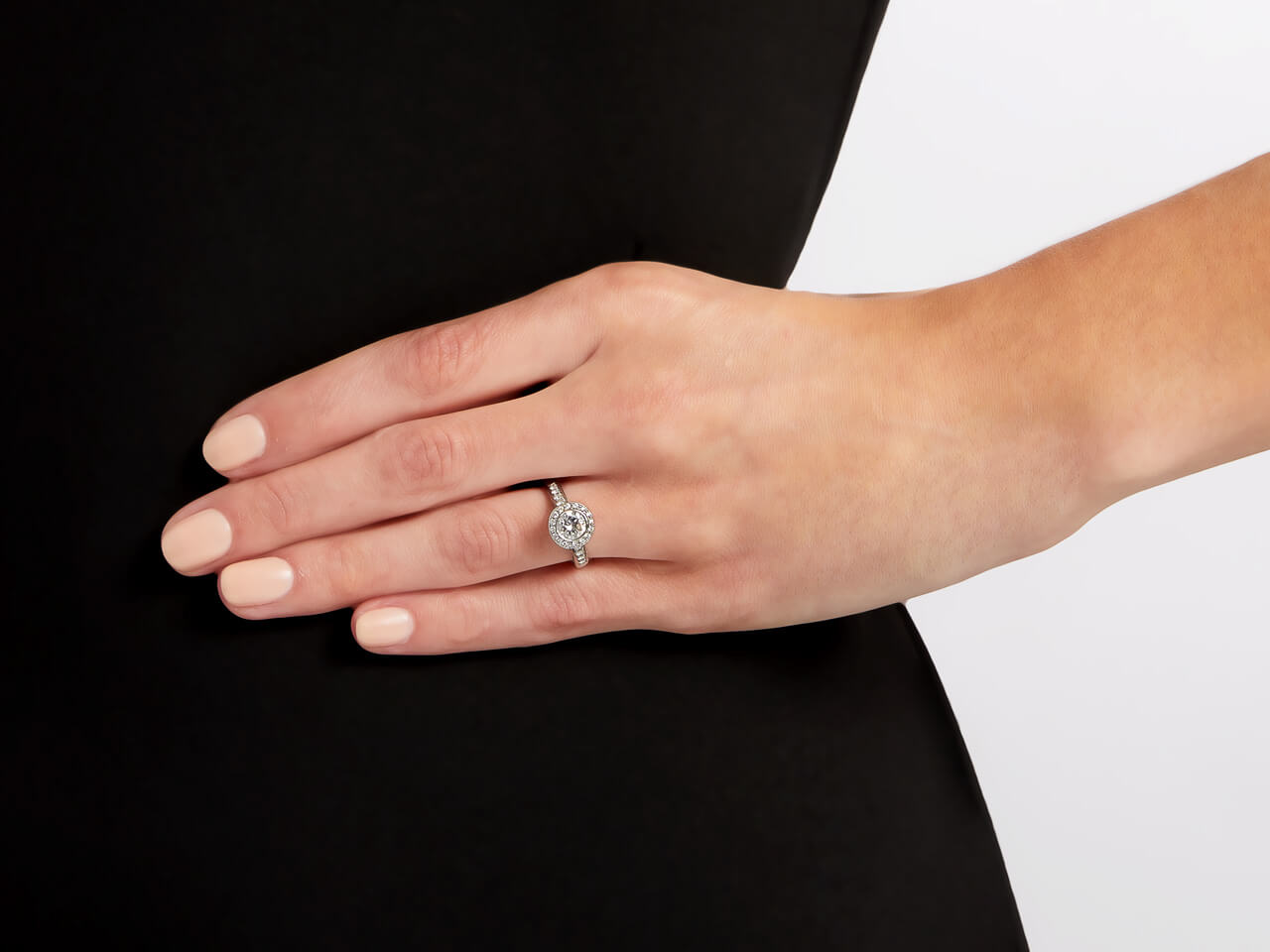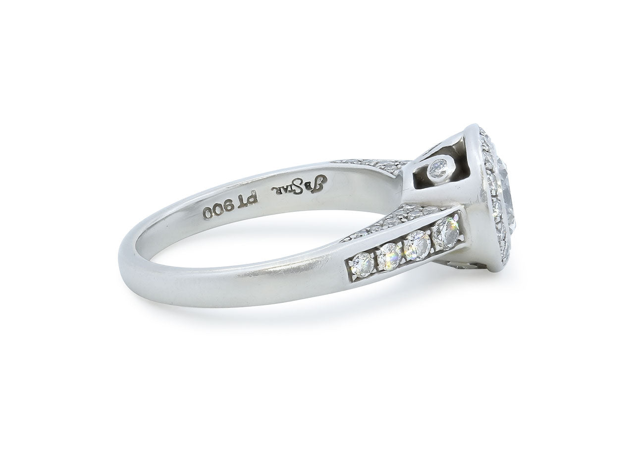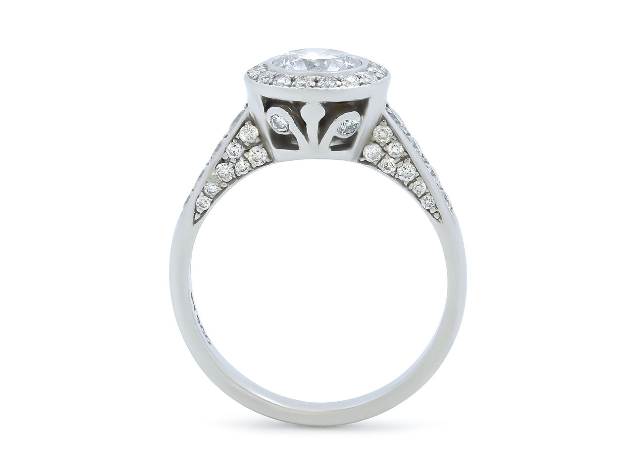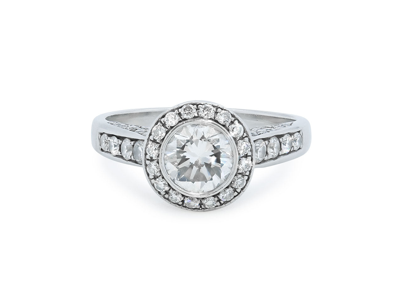 Featuring a 0.69 carat diamond within a diamond halo, in an openwork gallery, to diamond shoulders, set in platinum.