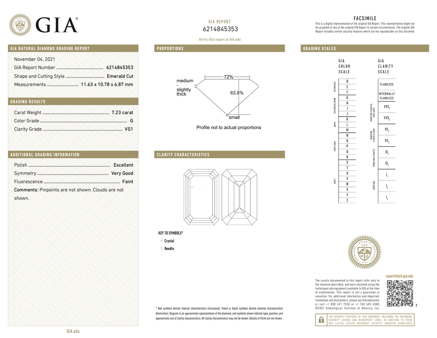 - Gem Stone: Diamond 7.23 carats Emerald cut G/VS1 GIA 6214845353