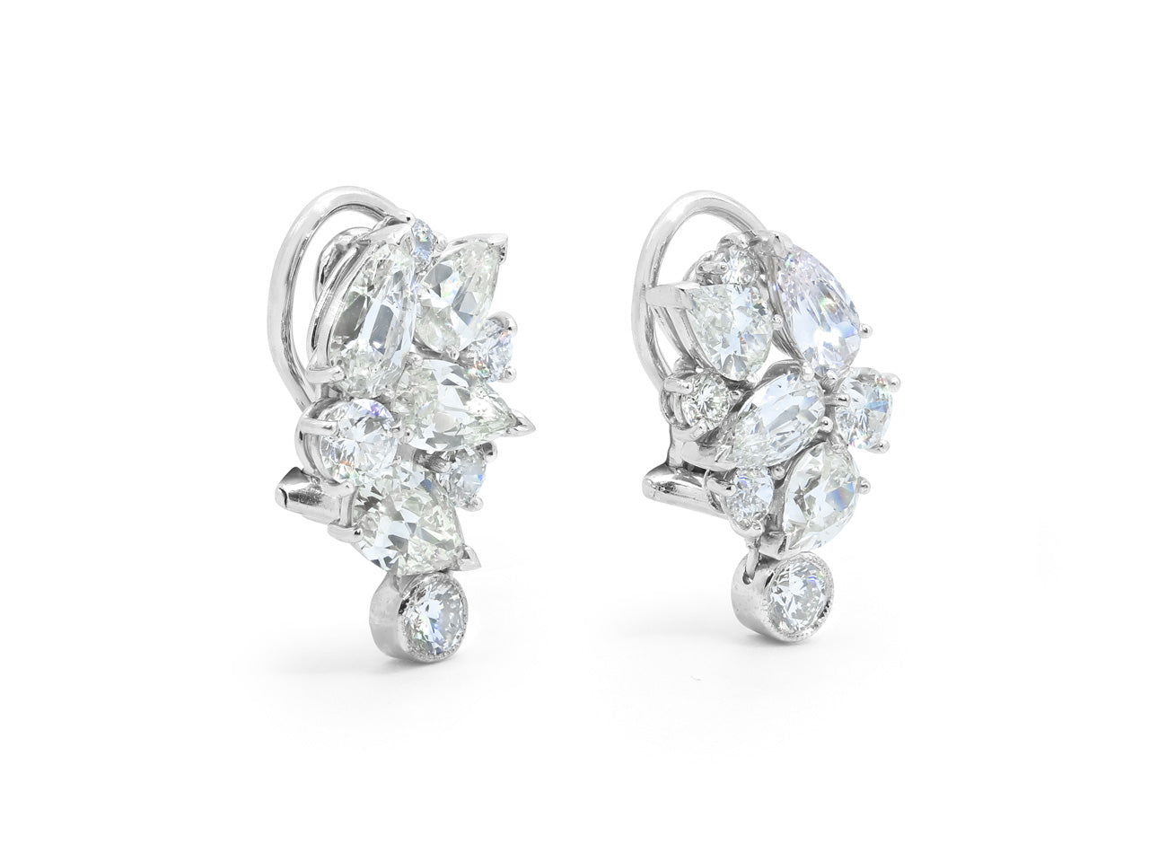 Each cluster set with four old cut pear shape and round brilliant diamonds, suspending a single millegrain set round diamond, in platinum with omega backs.
