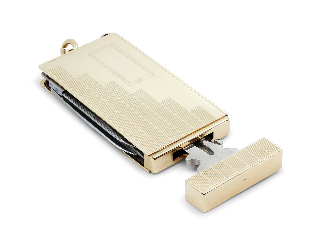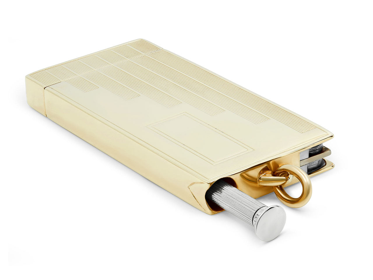 Fob in high polish gold, decorated with graduating, fluted bars. With one retractable blade, one retractable file, one pencil and a key blank. In 14k gold, with steel blade, file and key blank.