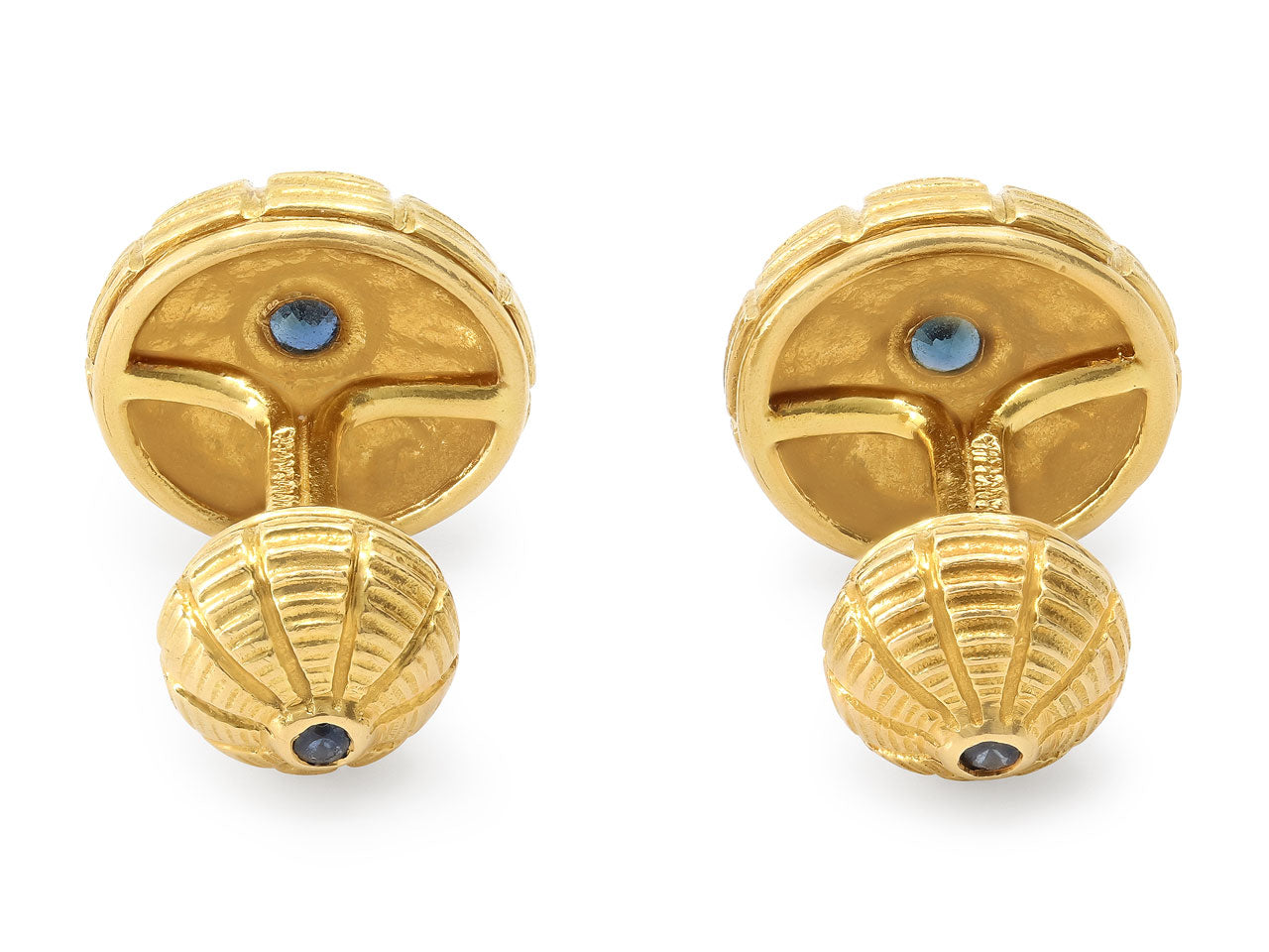 Each cufflink designed as an engraved dome topped by a sapphire, together with four shirt studs en suite. In 18k gold; one shirt stud with 14k back. Signed Tiffany & Co., Schlumberger.