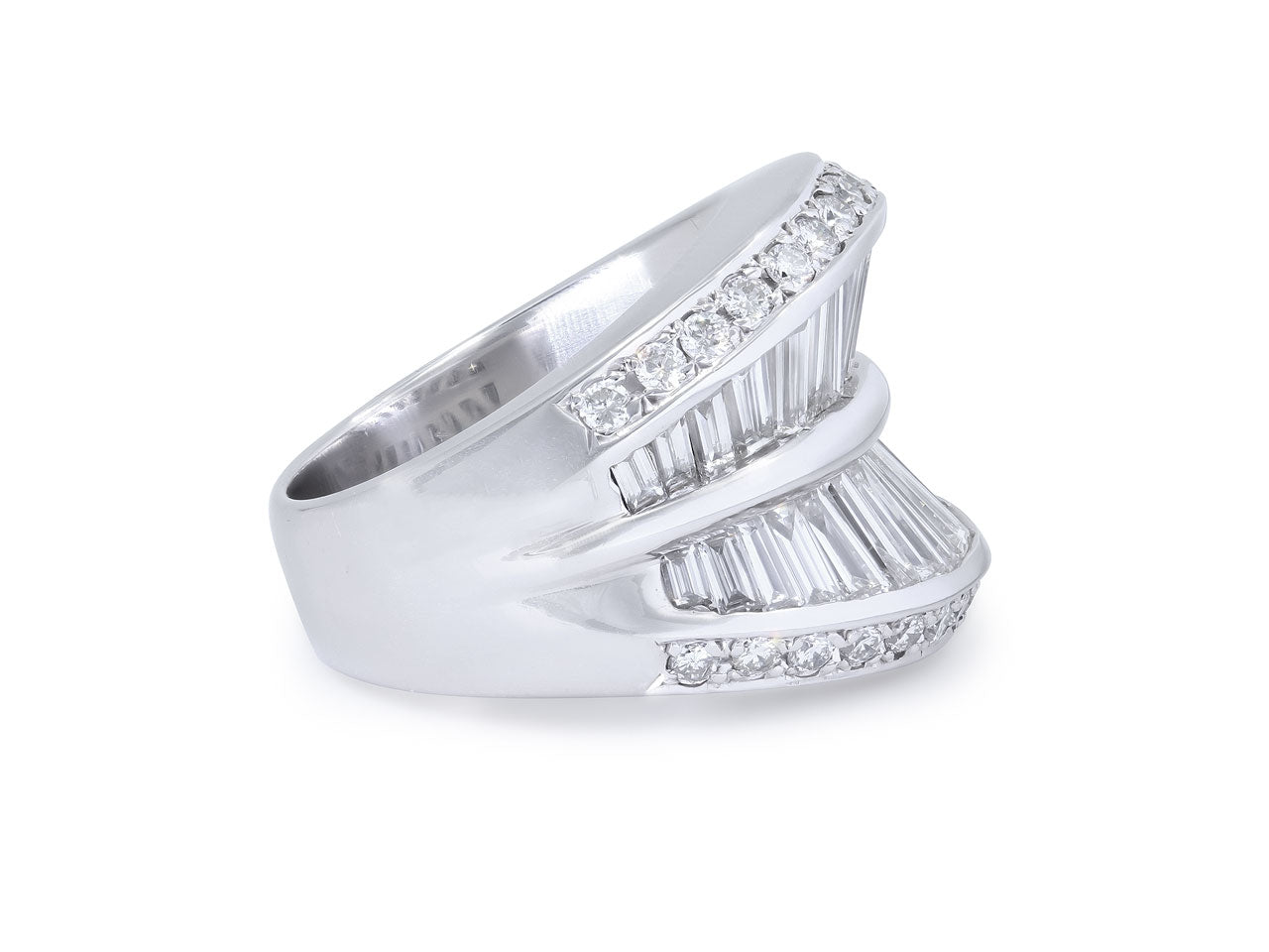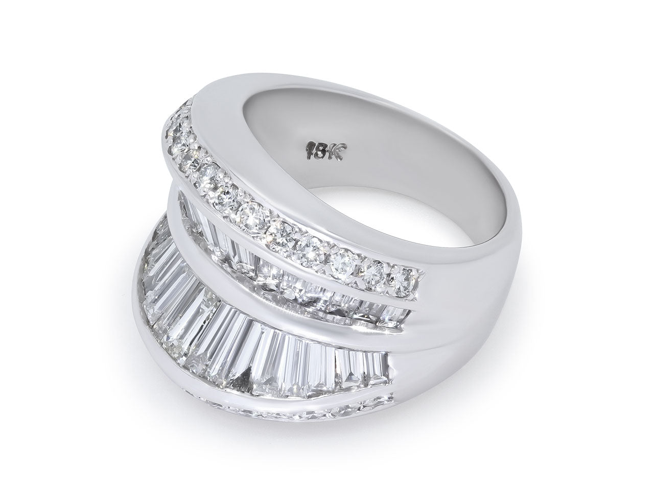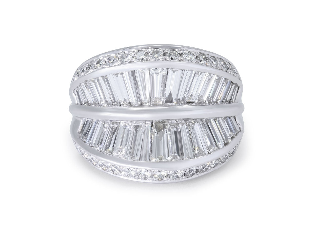 Two rows of tapered baguette diamonds flanked by a row of full-cut diamonds, in 18k white gold.