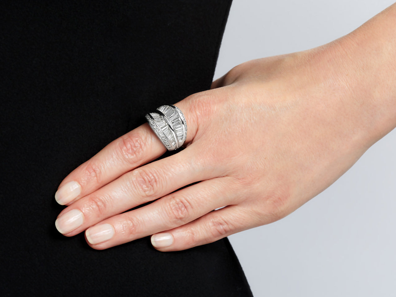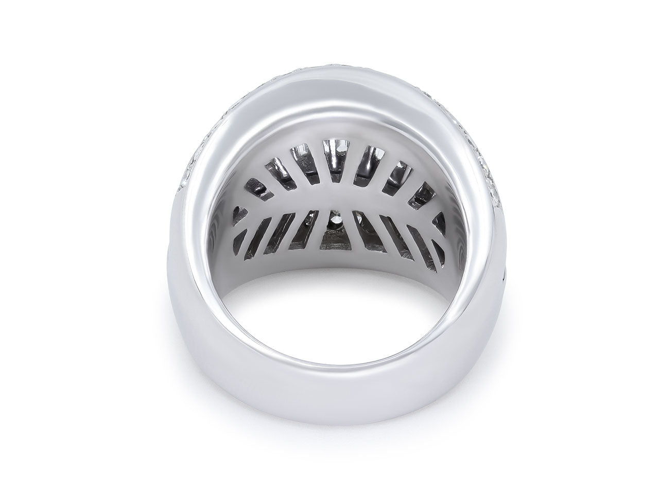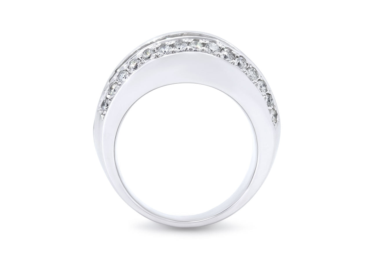 Two rows of tapered baguette diamonds flanked by a row of full-cut diamonds, in 18k white gold.