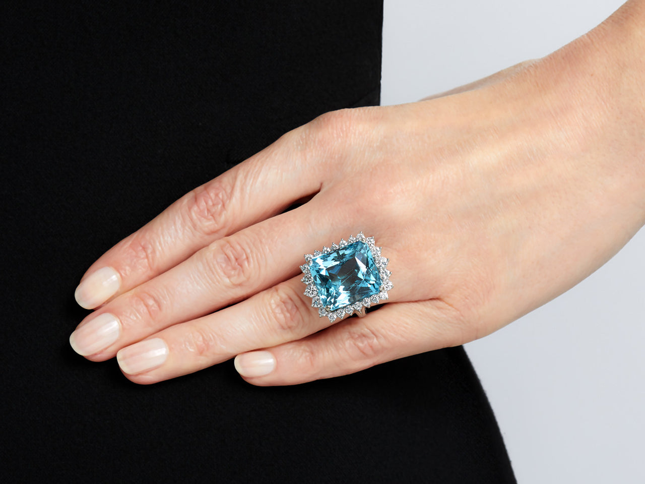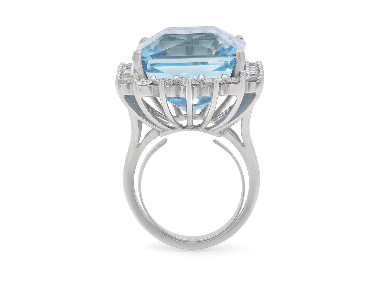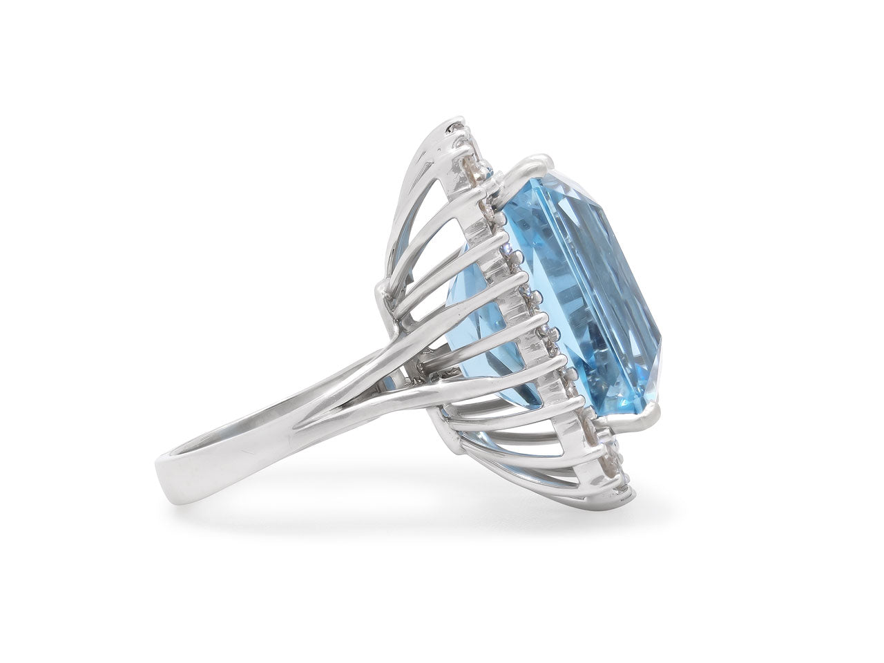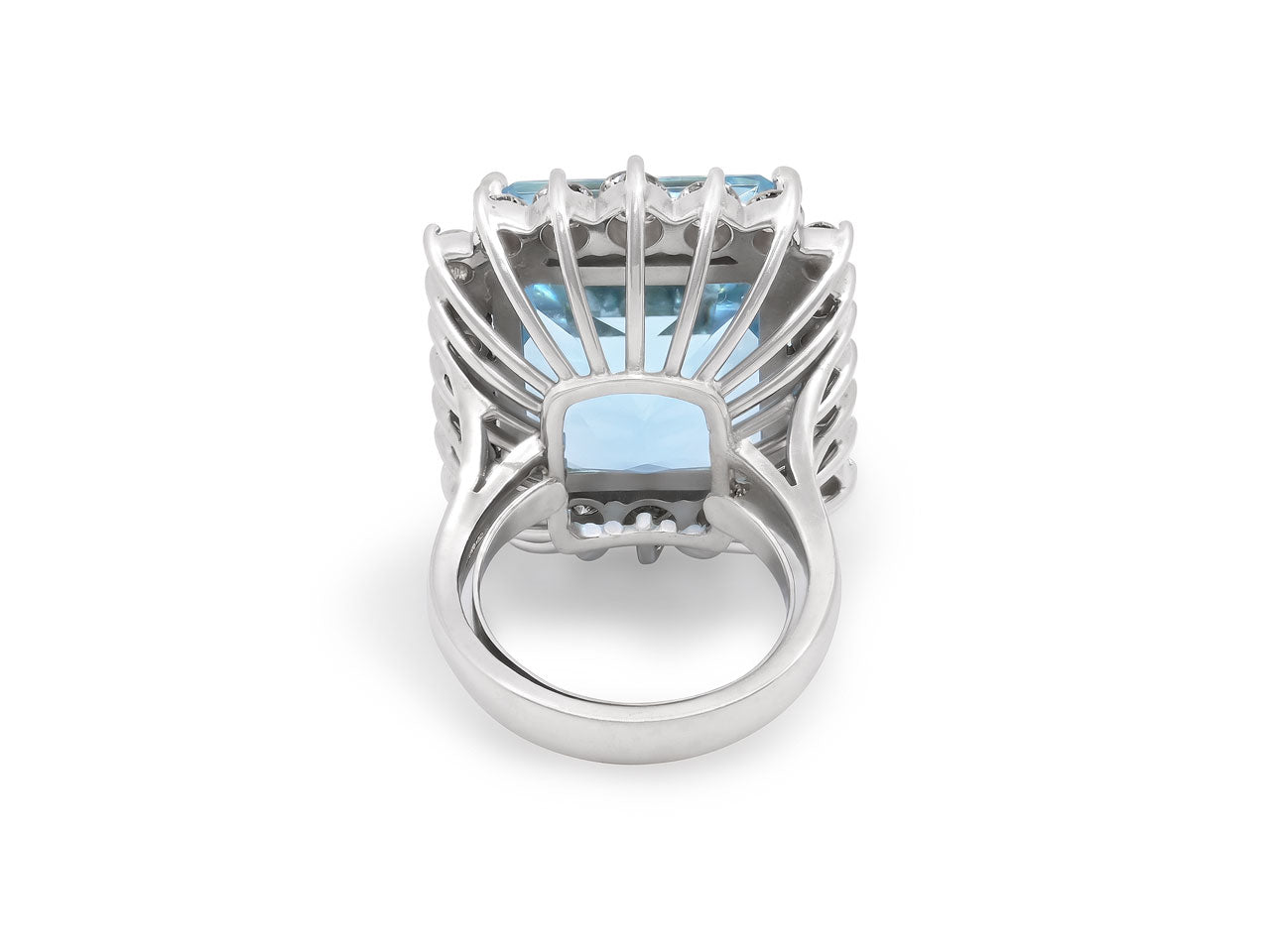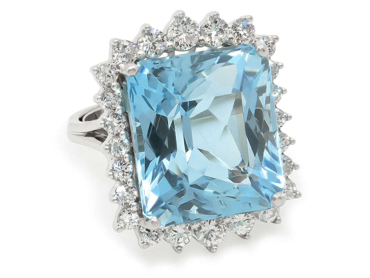 The octagonal brilliant-cut aquamarine, weighing 22.58 carats, set within a halo of round diamonds, in 14k white gold.