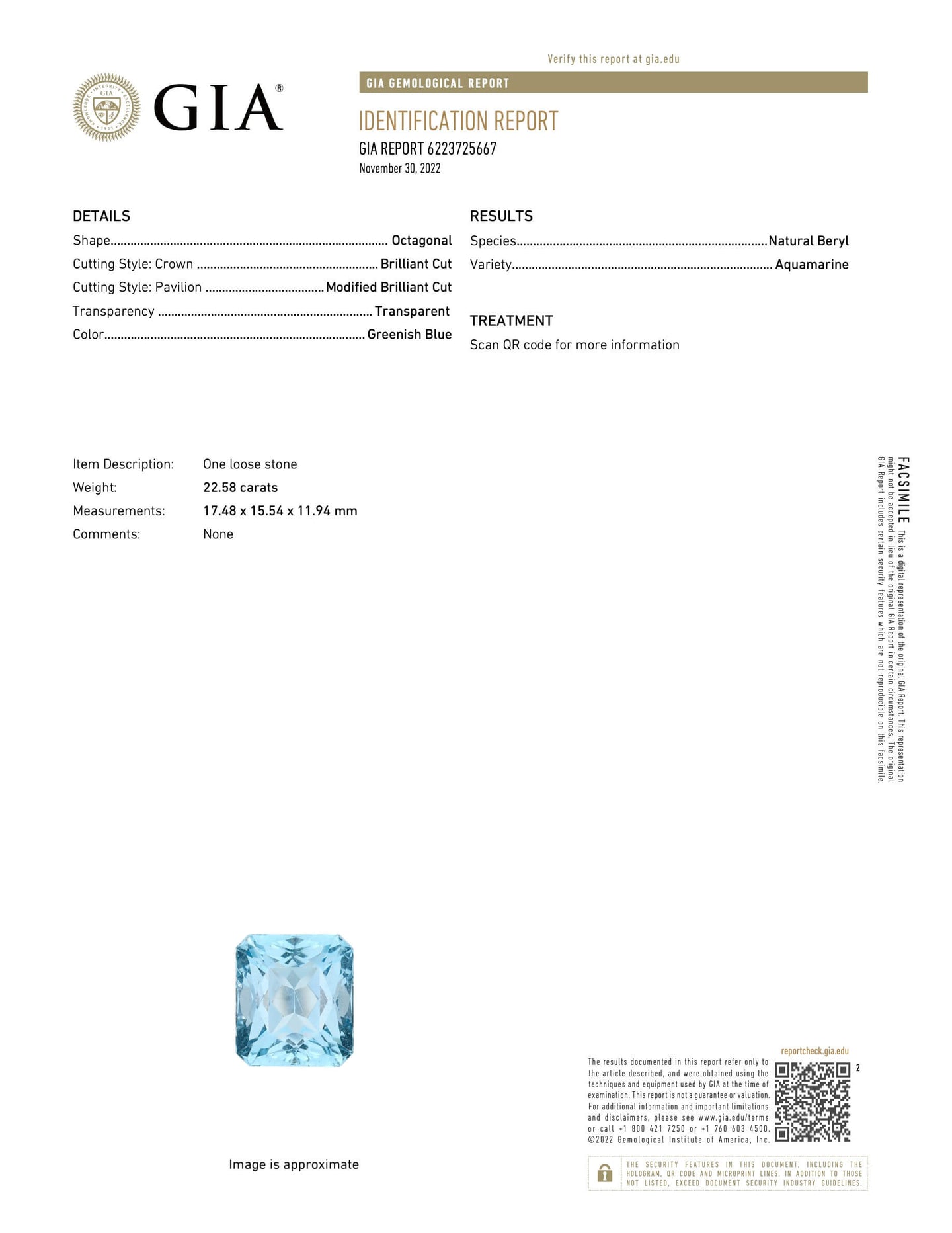 - Gem Stone: Aquamarine 22.58 carats GIA Report No. 6223725667