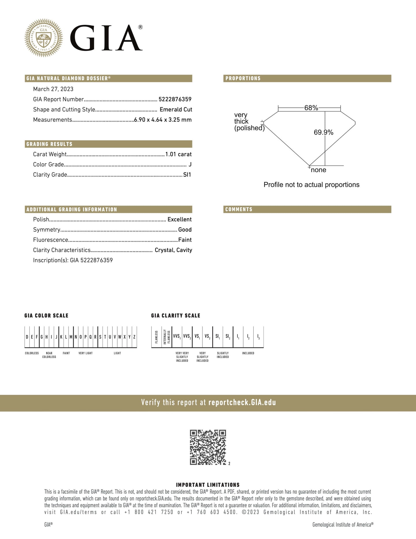 - Gem Stone: Diamond 1.01 carats Emerald cut J/SI1 GIA Report No. 5222876359