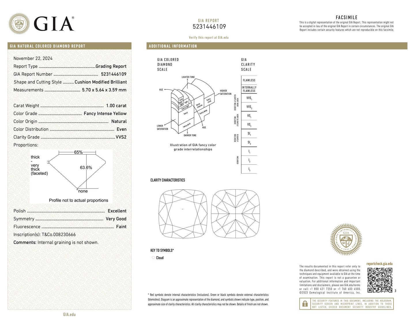 - Gem Stone: Yellow Diamond 1.00 carats Cushion Modified Brilliant cut Fancy Intense Yellow/VVS2
