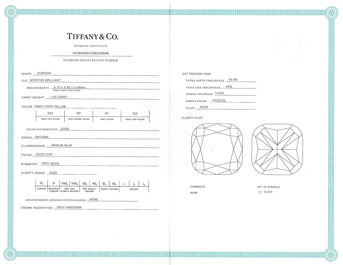 Also accompanied by the original Tiffany & Co. diamond certificate stating that the yellow diamond is Fancy Vivid Yellow color. Includes manufacturer's box and paperwork.