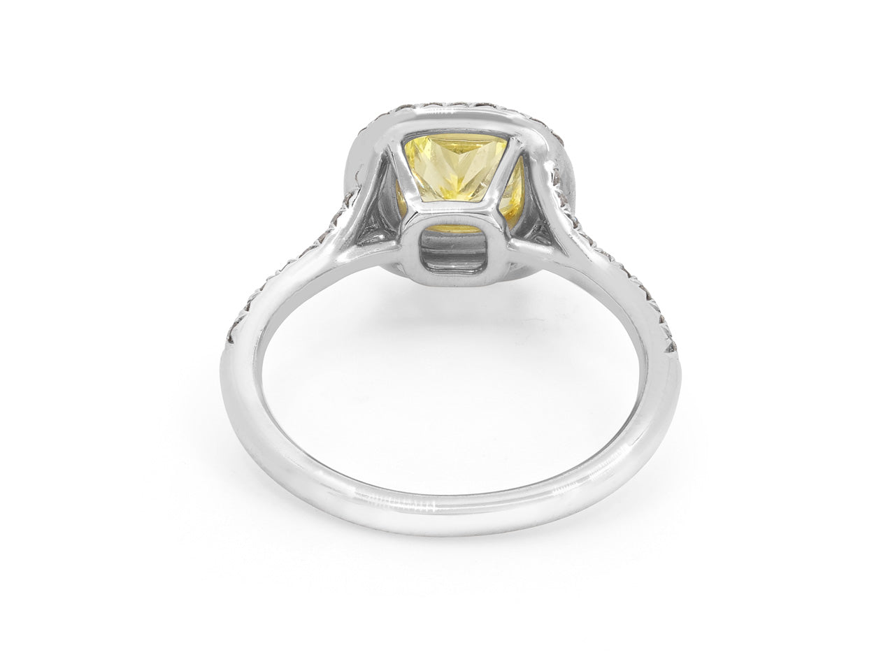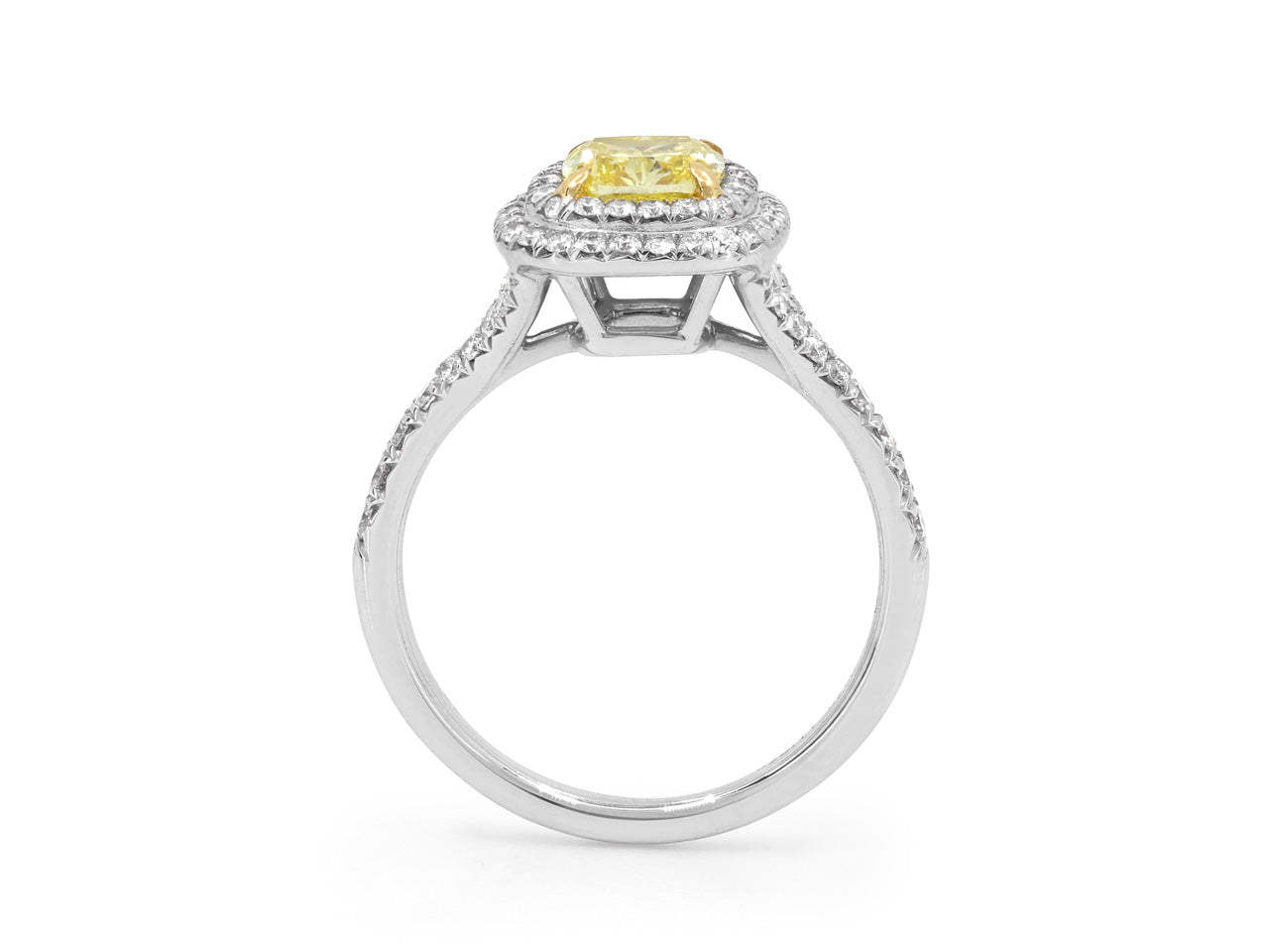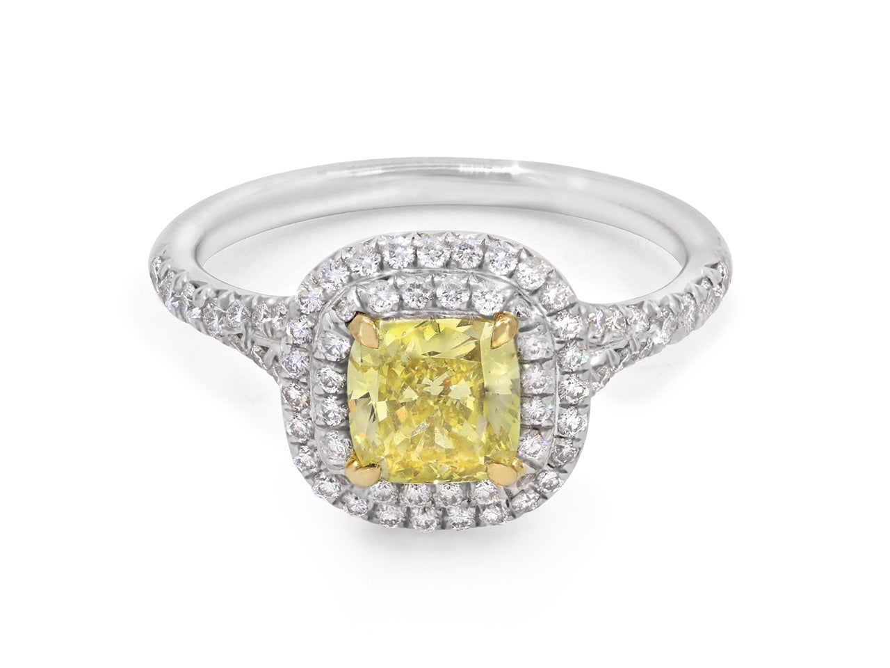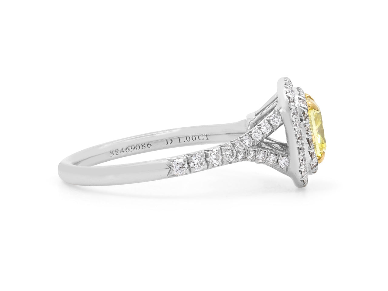 Set with a 1.00 carat cushion-cut yellow diamond, within a halo of double diamond rows, on a diamond band, in platinum with yellow gold prongs. Signed Tiffany & Co.