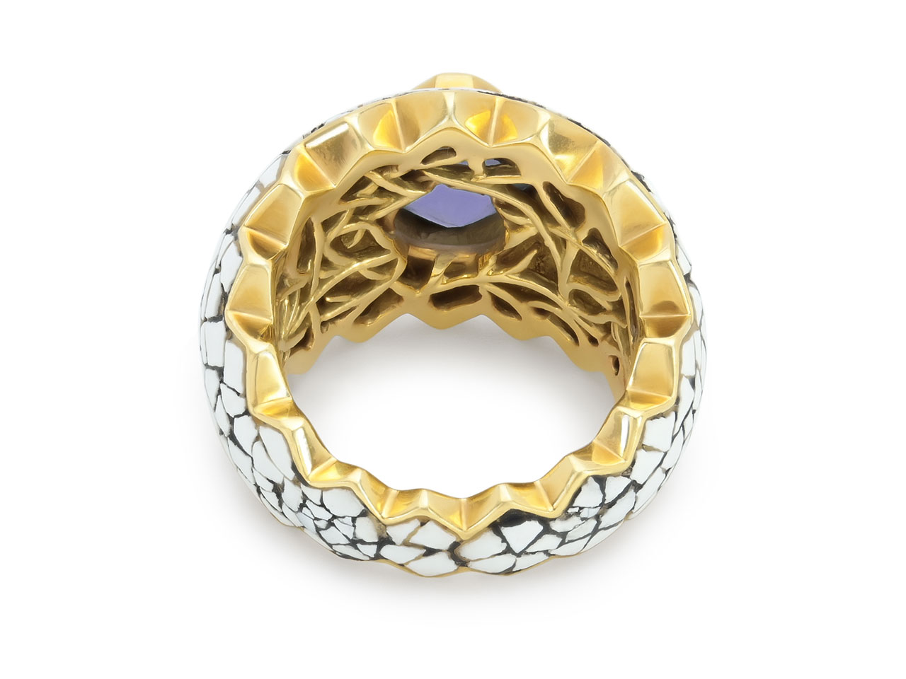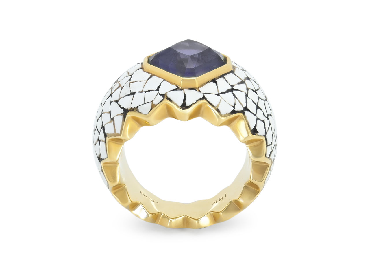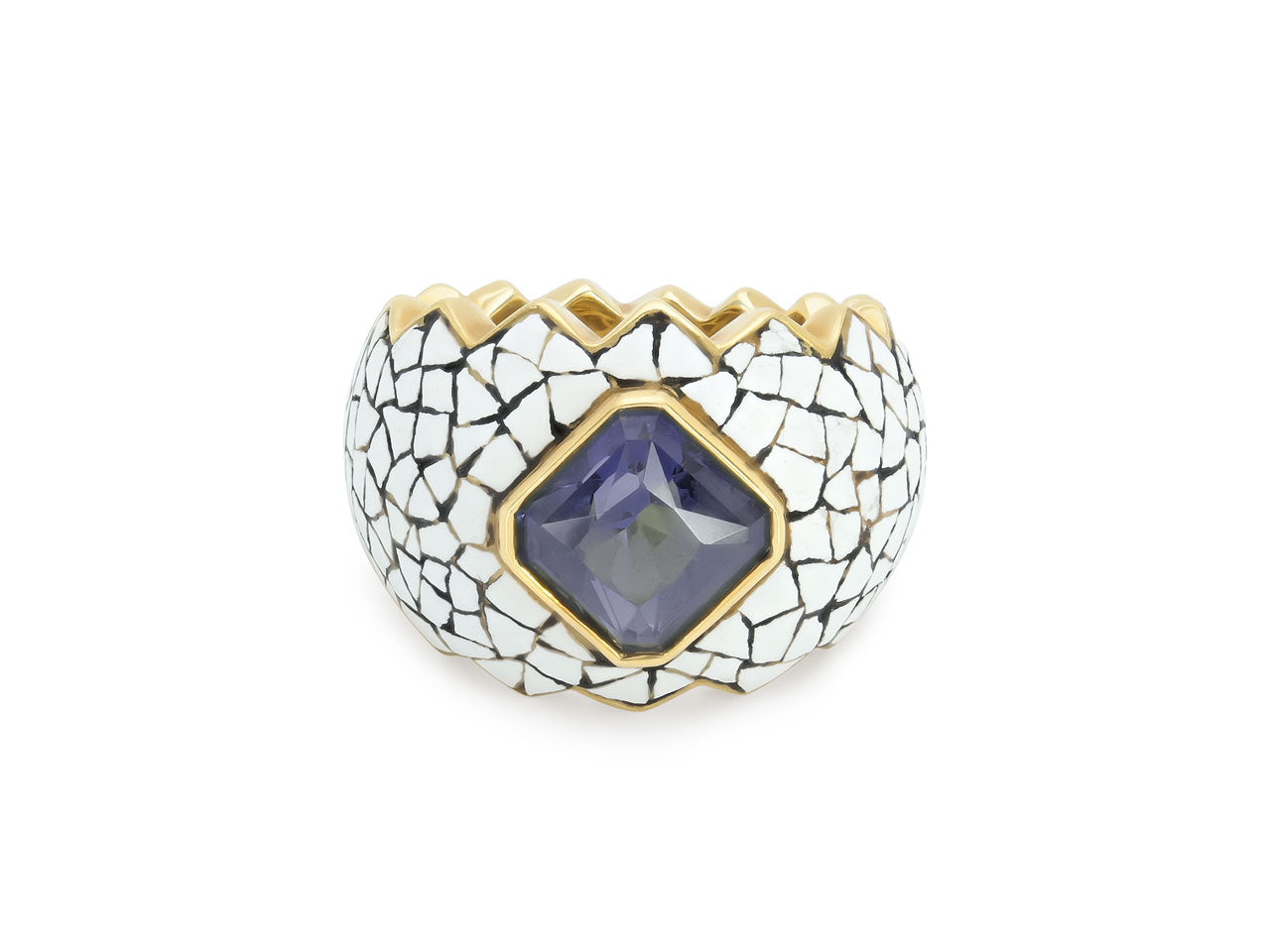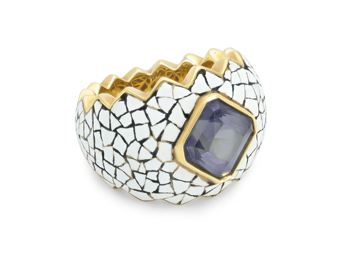 The wide band with serrated edges, the purplish blue spinel bezel-set within a white enamel, in 18k yellow gold. Signed N Varney.