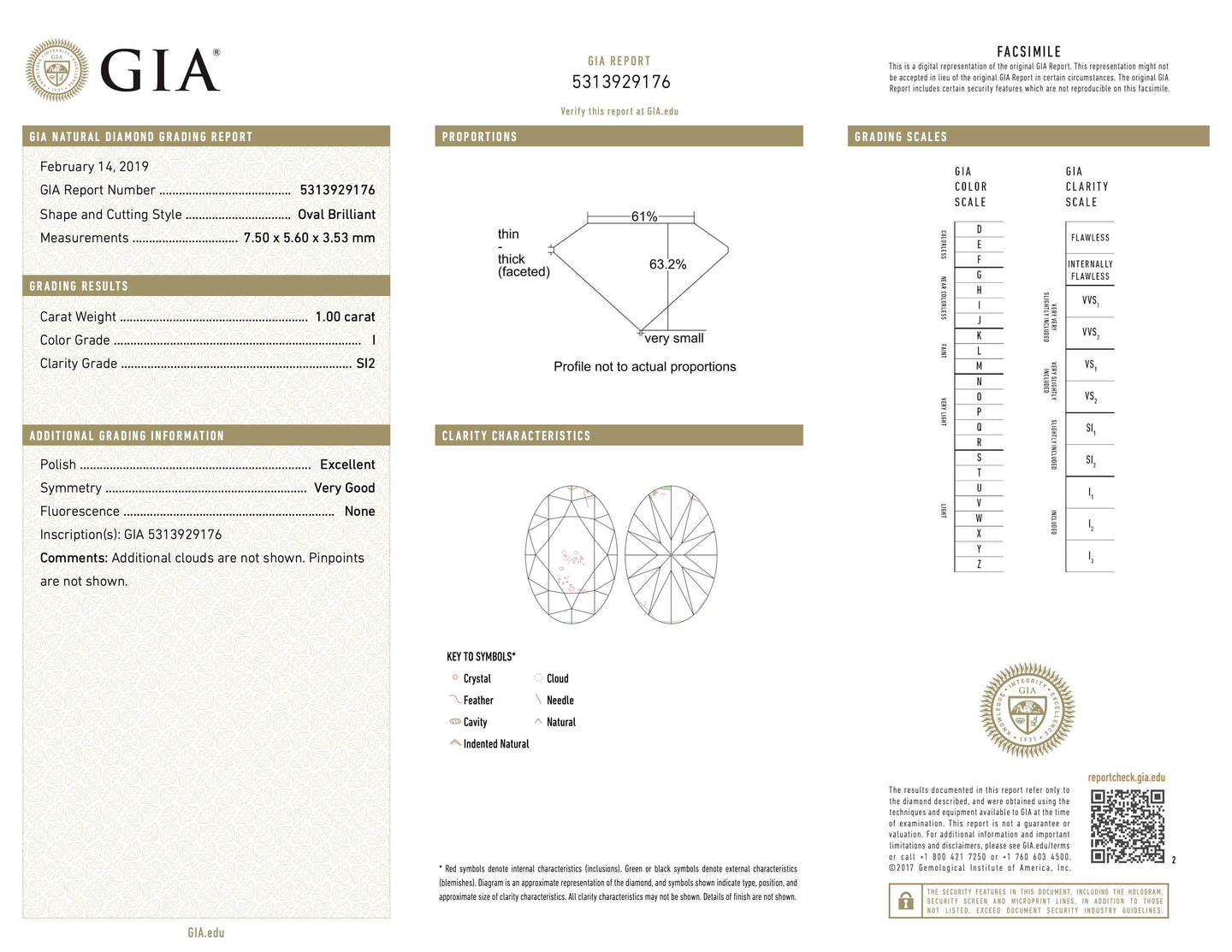 - Gem Stone: Diamond 1.00 carats Oval cut I/SI2 GIA Report No. 5313929176