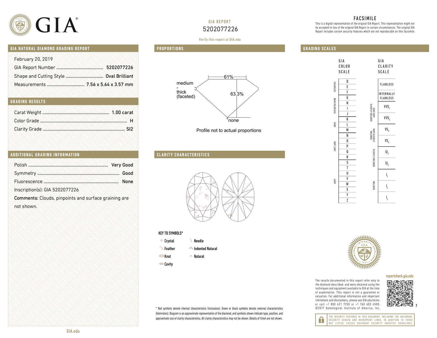 - Gem Stone: Diamond 1.00 carats Oval cut H/SI2 GIA Report No. 5202077226