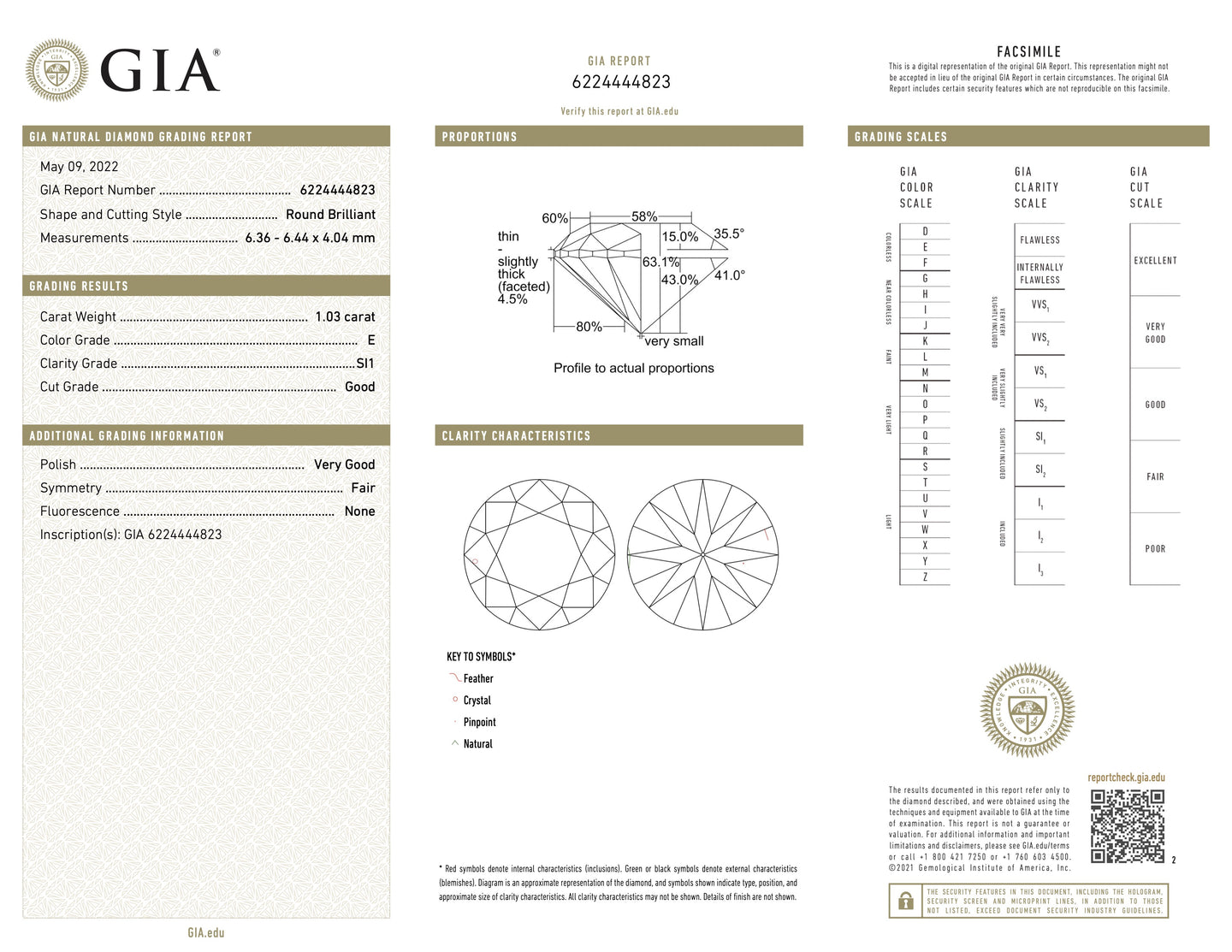 - Gem Stone: Diamond 1.03 carats Round Brilliant cut E/SI1 GIA 6224444823