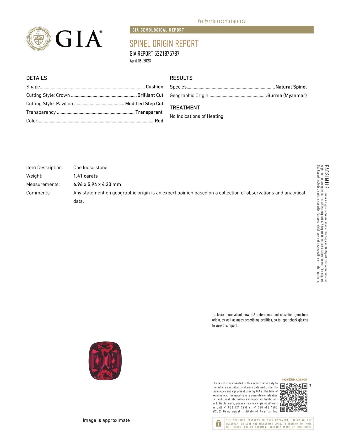 Accompanied by a GIA (Gemological institute of America) report stating the spinel is a natural red brilliant cushion cut, weighing 1.41 carats, of Burmese (Myanmar) origin, with no indications of heat treatment.