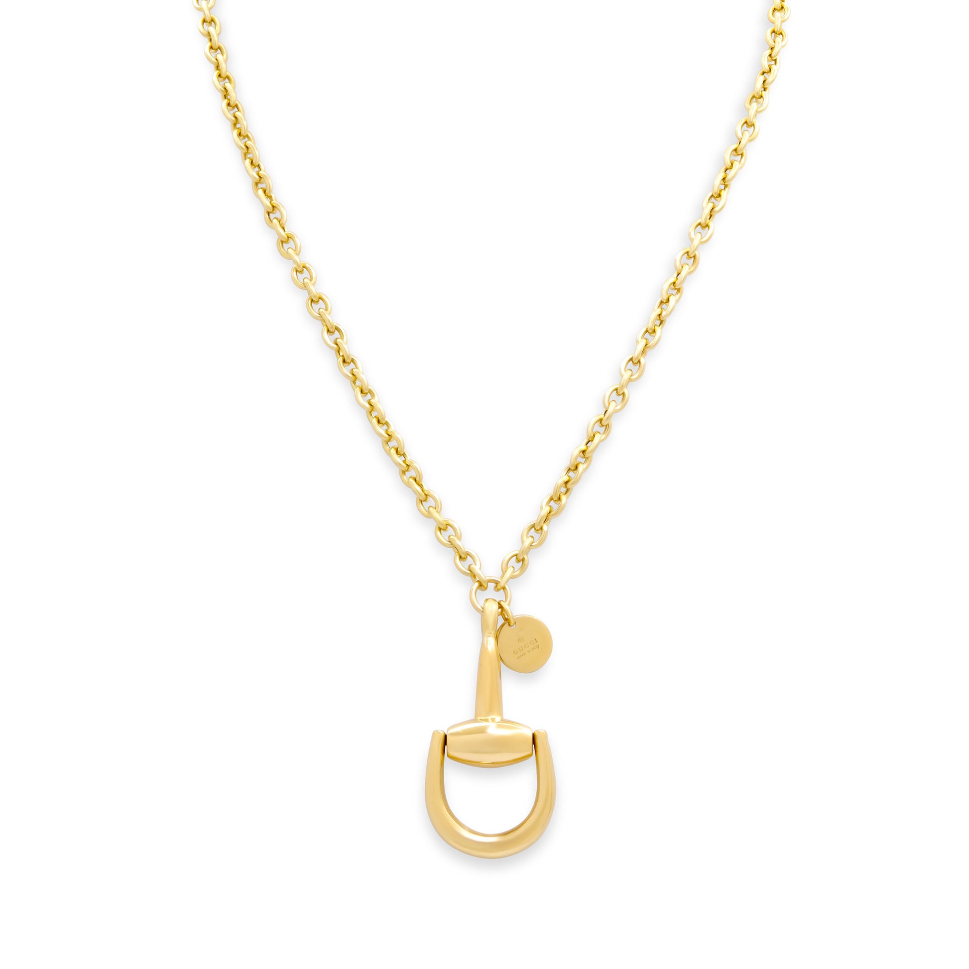 The high polish horsebit motif pendant suspended from an oval link chain, in 18k yellow gold. Signed Gucci. Includes manufacturer's box.