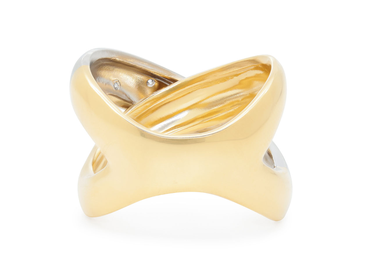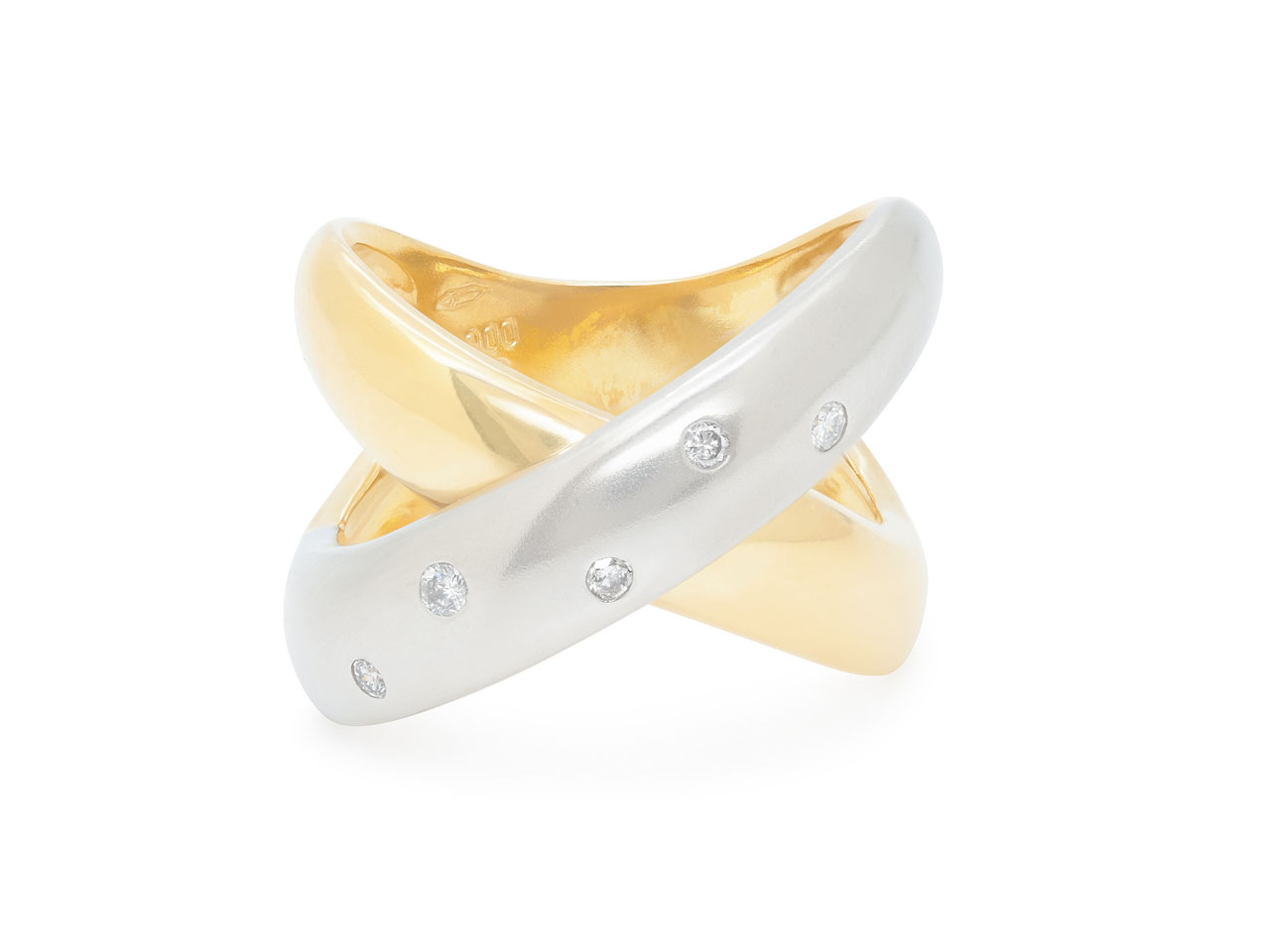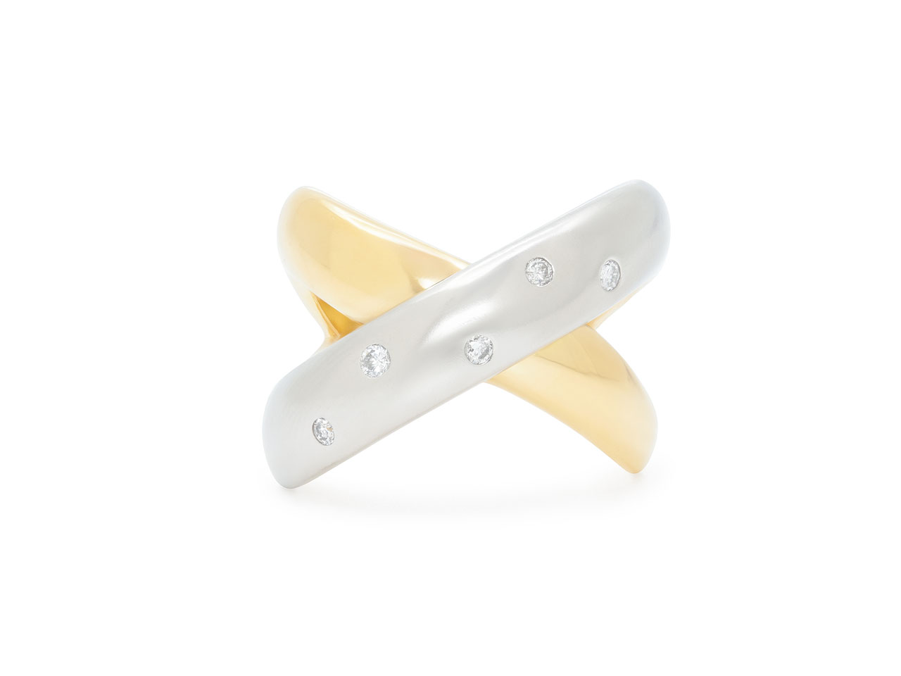 The overlapping 18k yellow gold and platinum bands forming an 'X' motif, the platinum band accented with five flush-set diamonds.