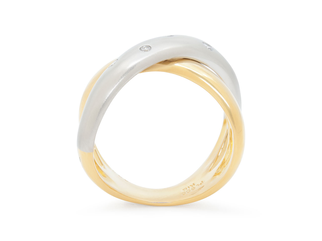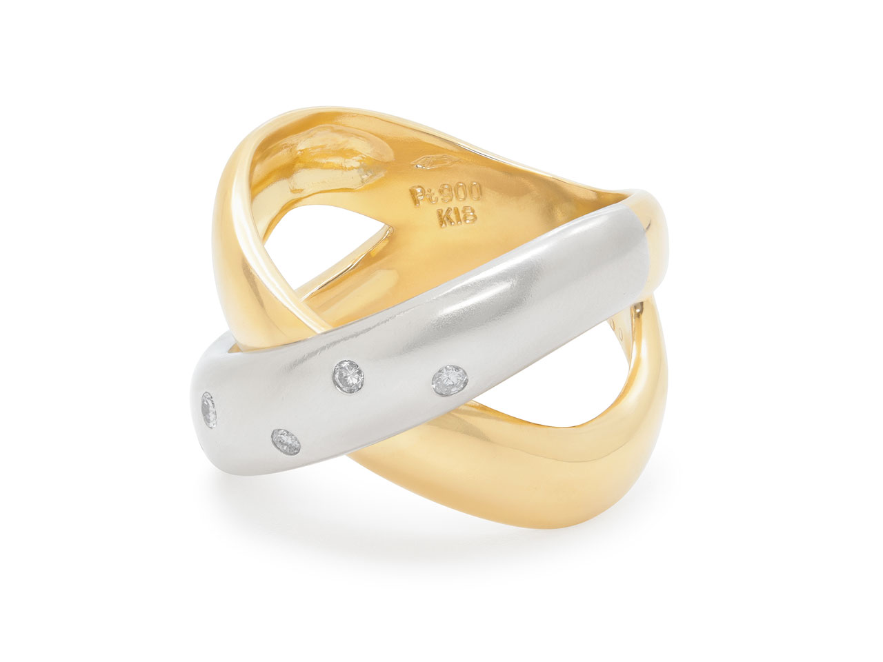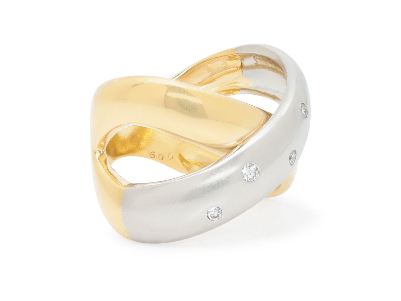 The overlapping 18k yellow gold and platinum bands forming an 'X' motif, the platinum band accented with five flush-set diamonds.