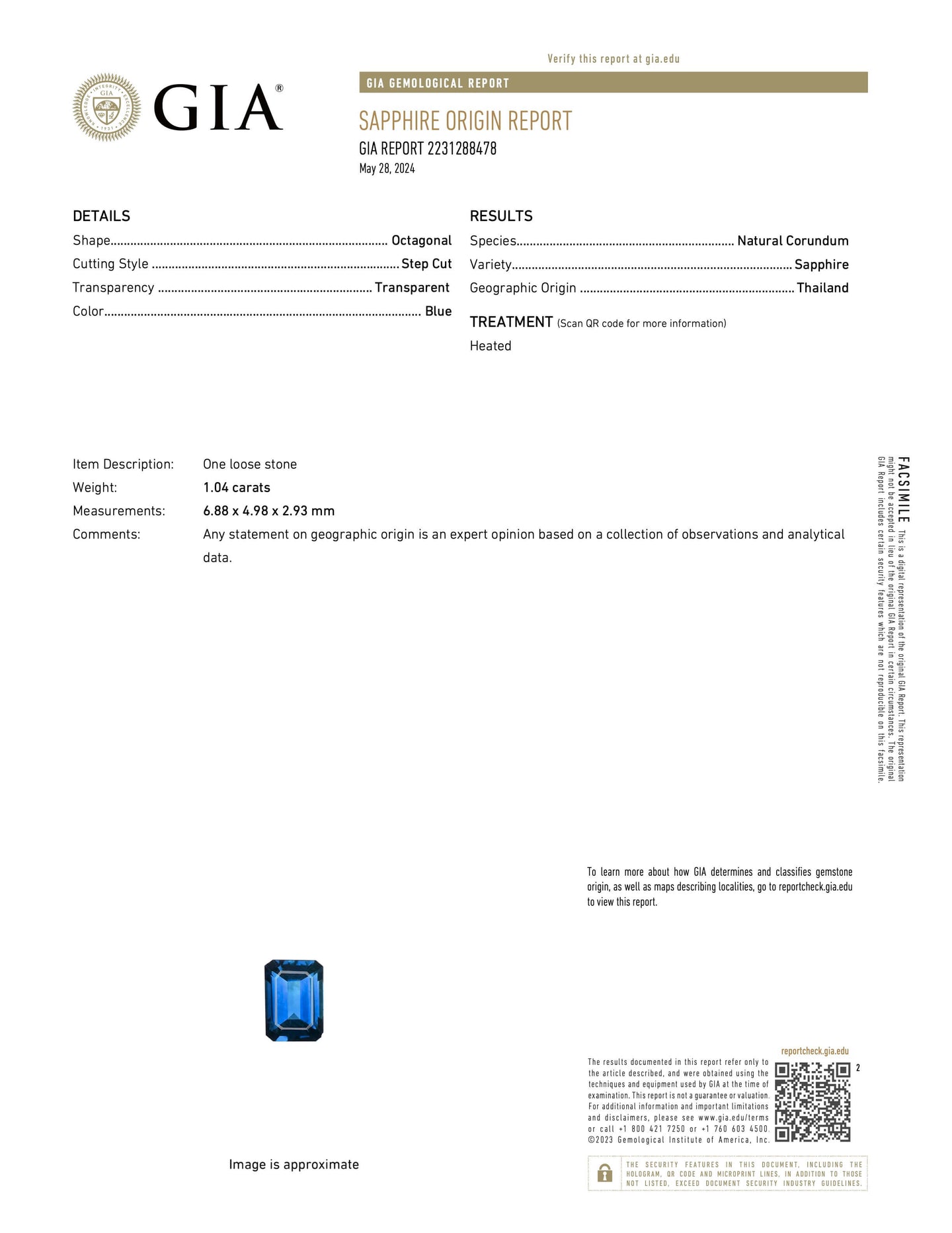 - Gem Stone: Sapphire 1.04 carats Octagonal cut GIA Report No. 2231288478