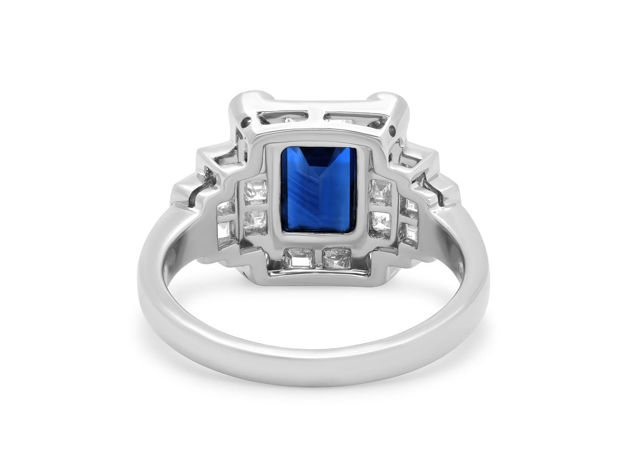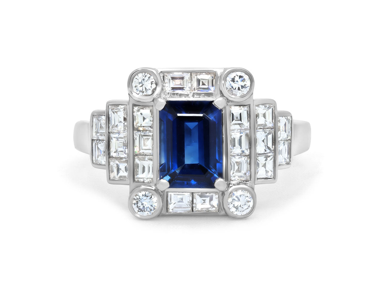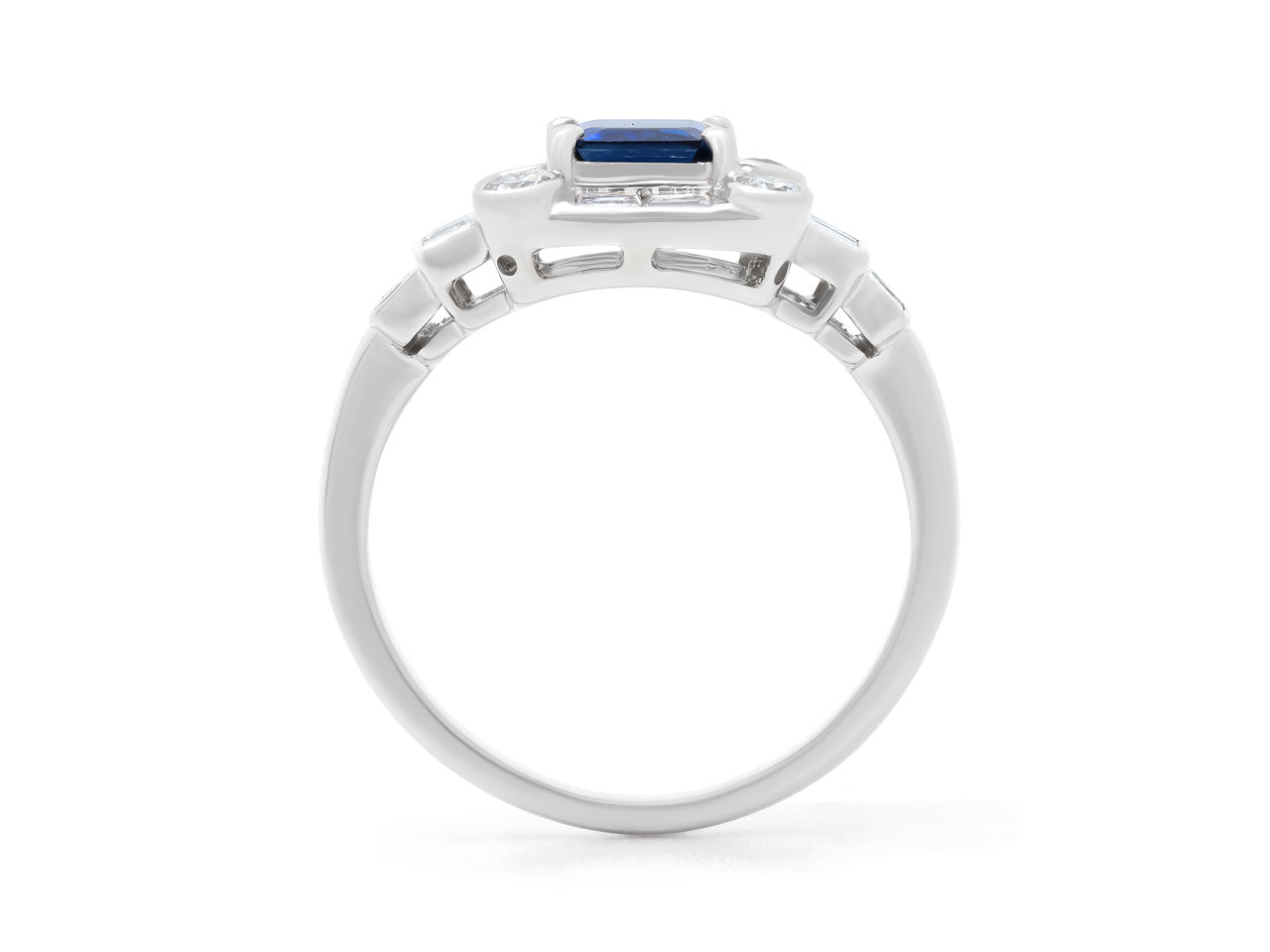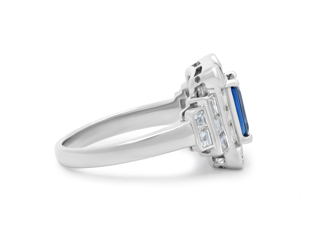 The bright blue color sapphire bordered by square-cut diamonds, with bezel-set round diamonds corners, to the tapering shoulder of square-cut diamonds, set in platinum.