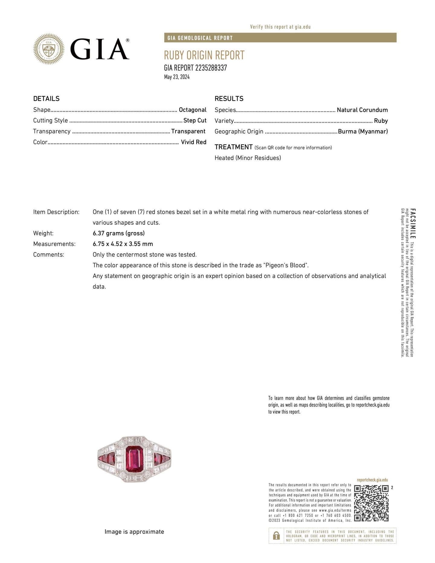 Accompanied by a GIA report stating the center ruby is a natural vivid red ruby, of Burmese (Myanmar) origin, with minor indications of heat treatment.