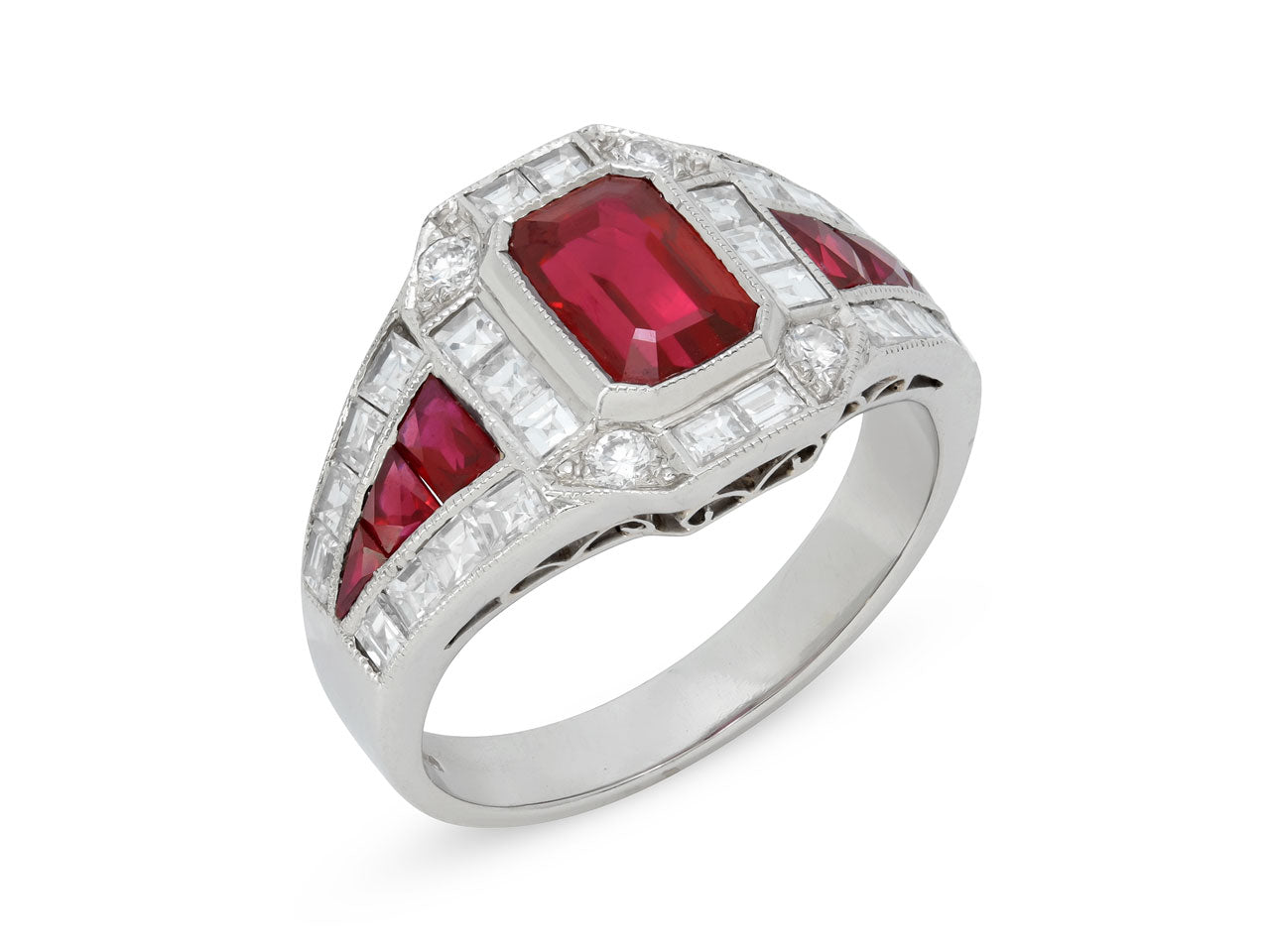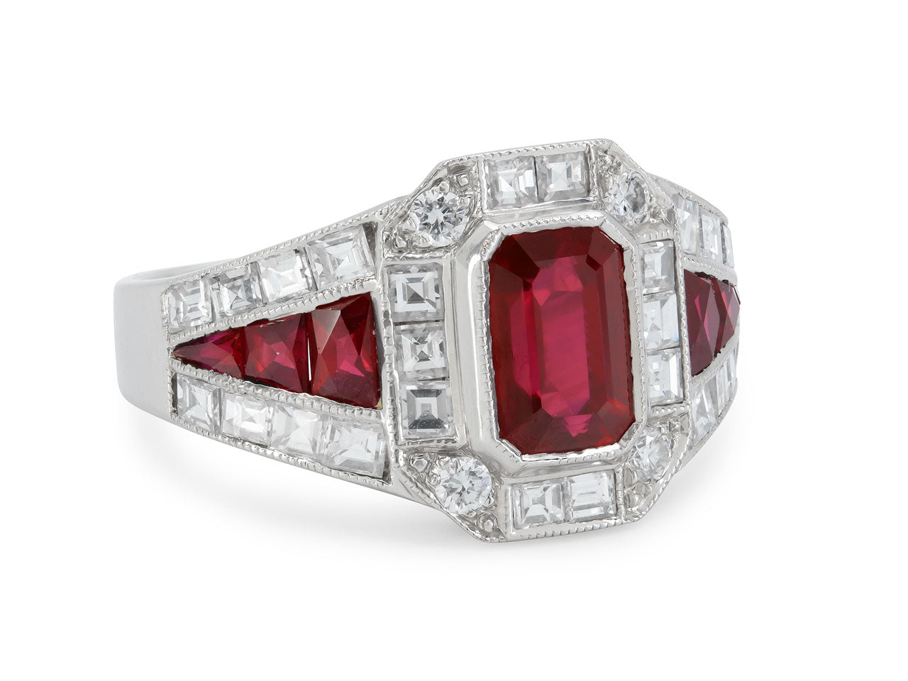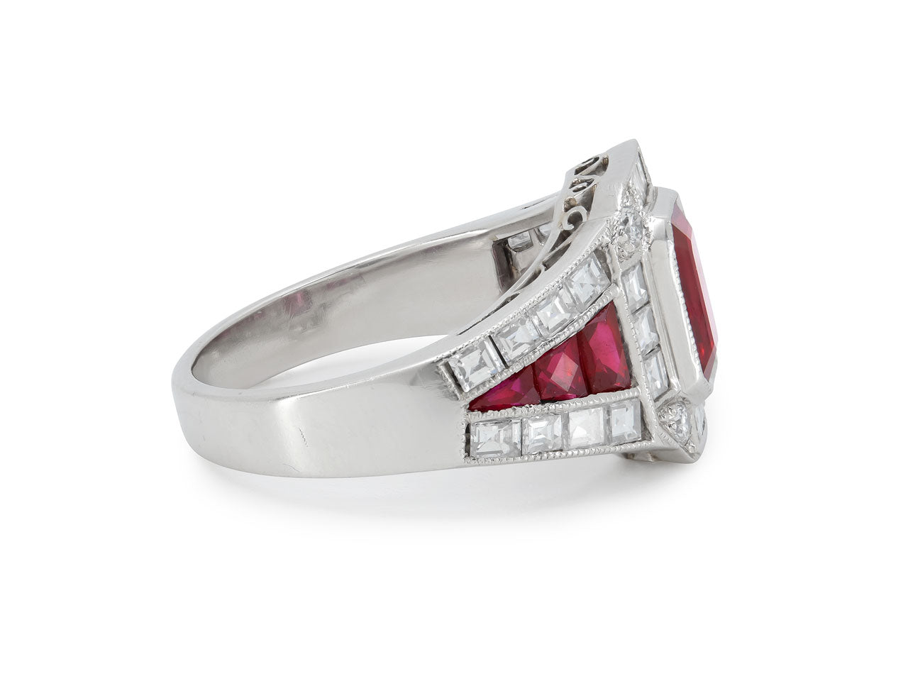 Centering on a bezel-set emerald cut Burma 'pigeon blood red' ruby, bordered by carré cut and round diamonds, each shoulder with calibré cut rubies flanked by carré cut diamond lines, in millegrain detailed platinum.