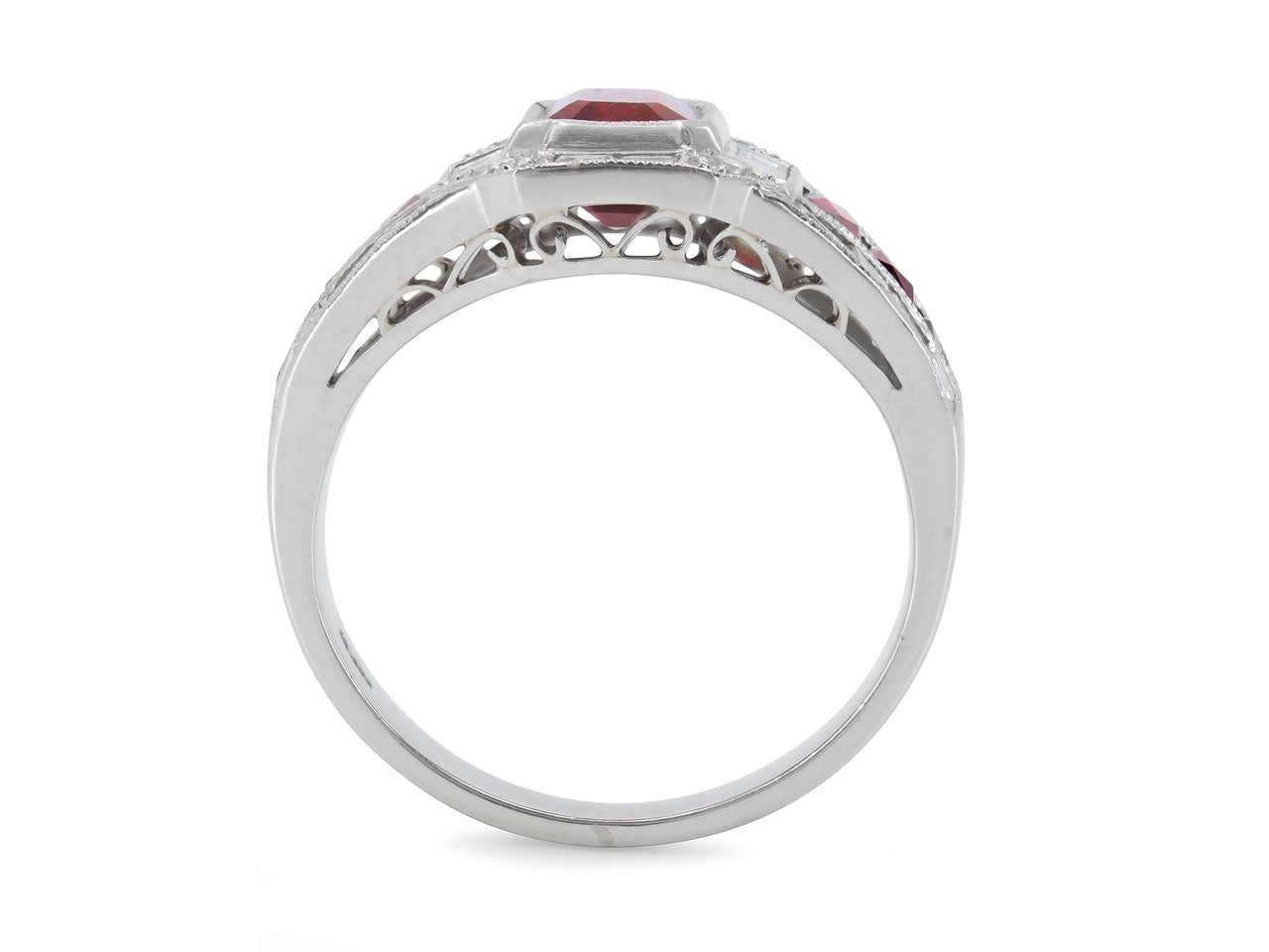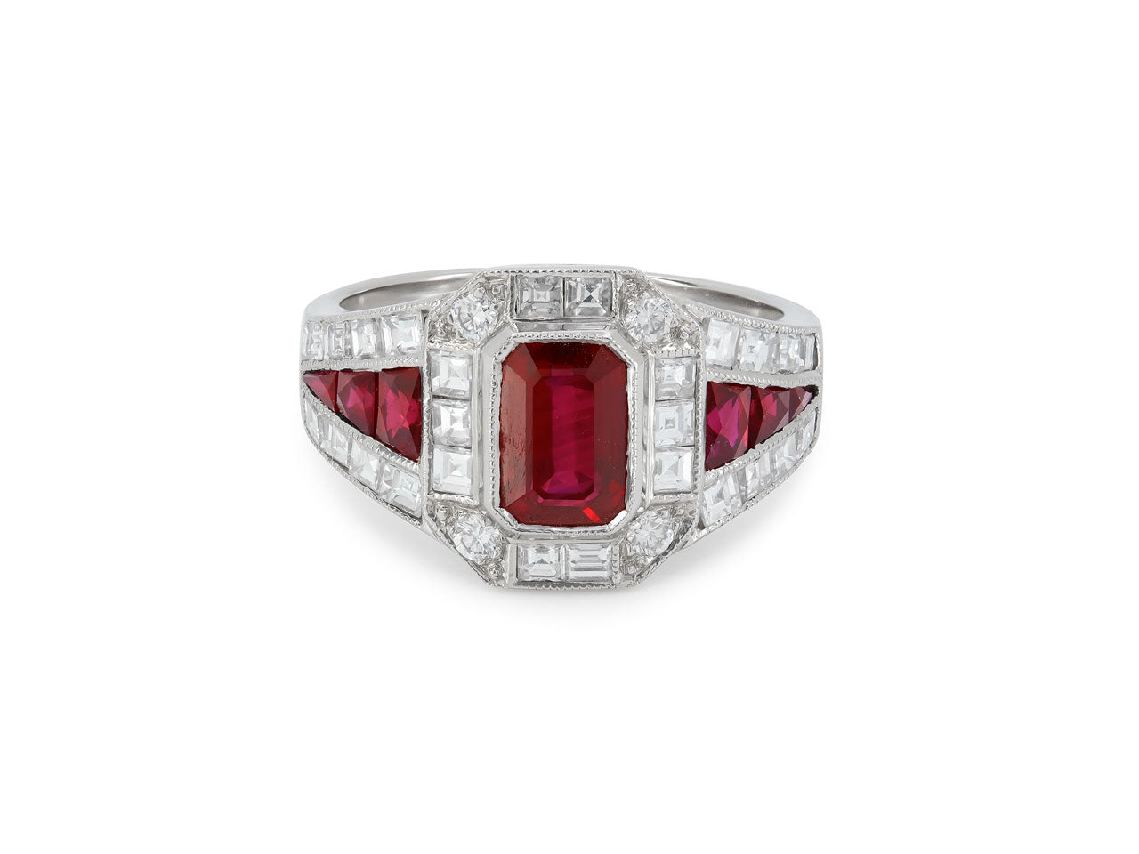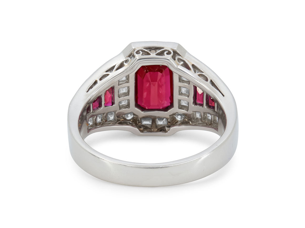 Centering on a bezel-set emerald cut Burma 'pigeon blood red' ruby, bordered by carré cut and round diamonds, each shoulder with calibré cut rubies flanked by carré cut diamond lines, in millegrain detailed platinum.