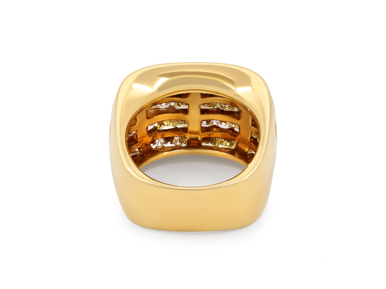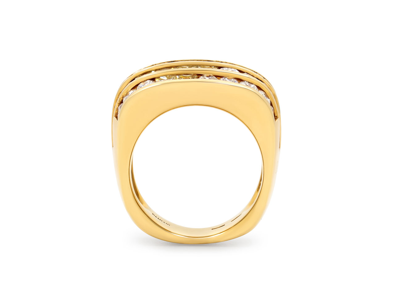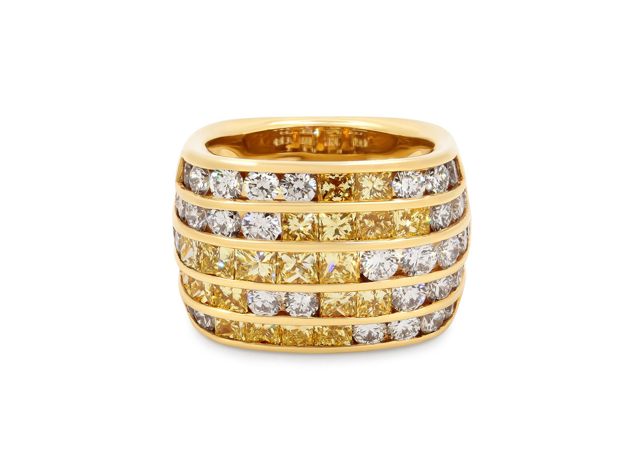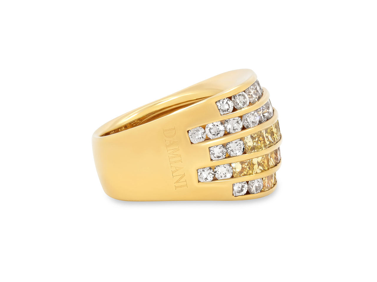 The ring top set with five lines of alternating round brilliant diamonds and yellow princess-cut diamonds, to the 18k yellow gold band. Signed Damiani, with Italian hallmarks. Includes manufacturer's box.