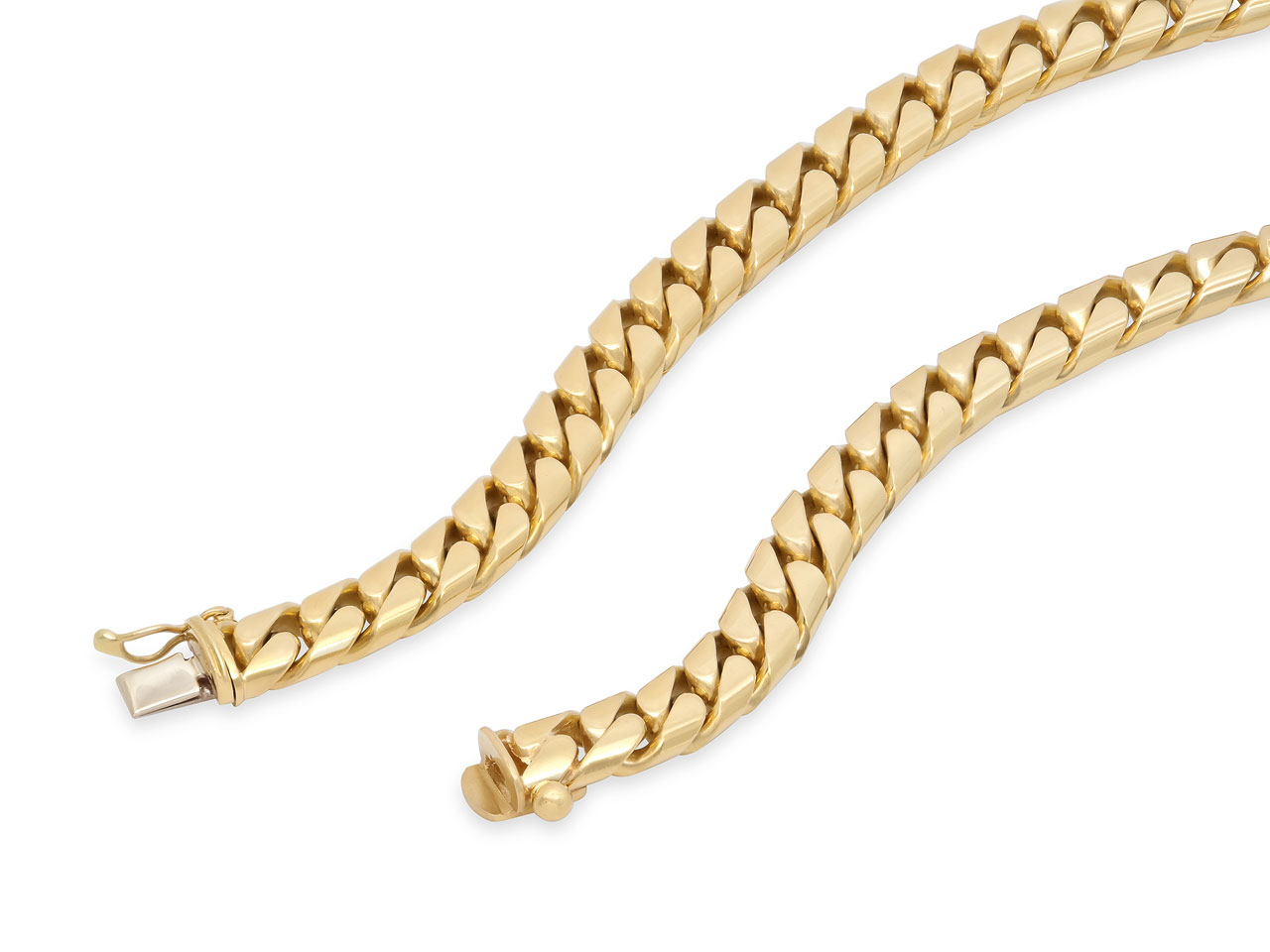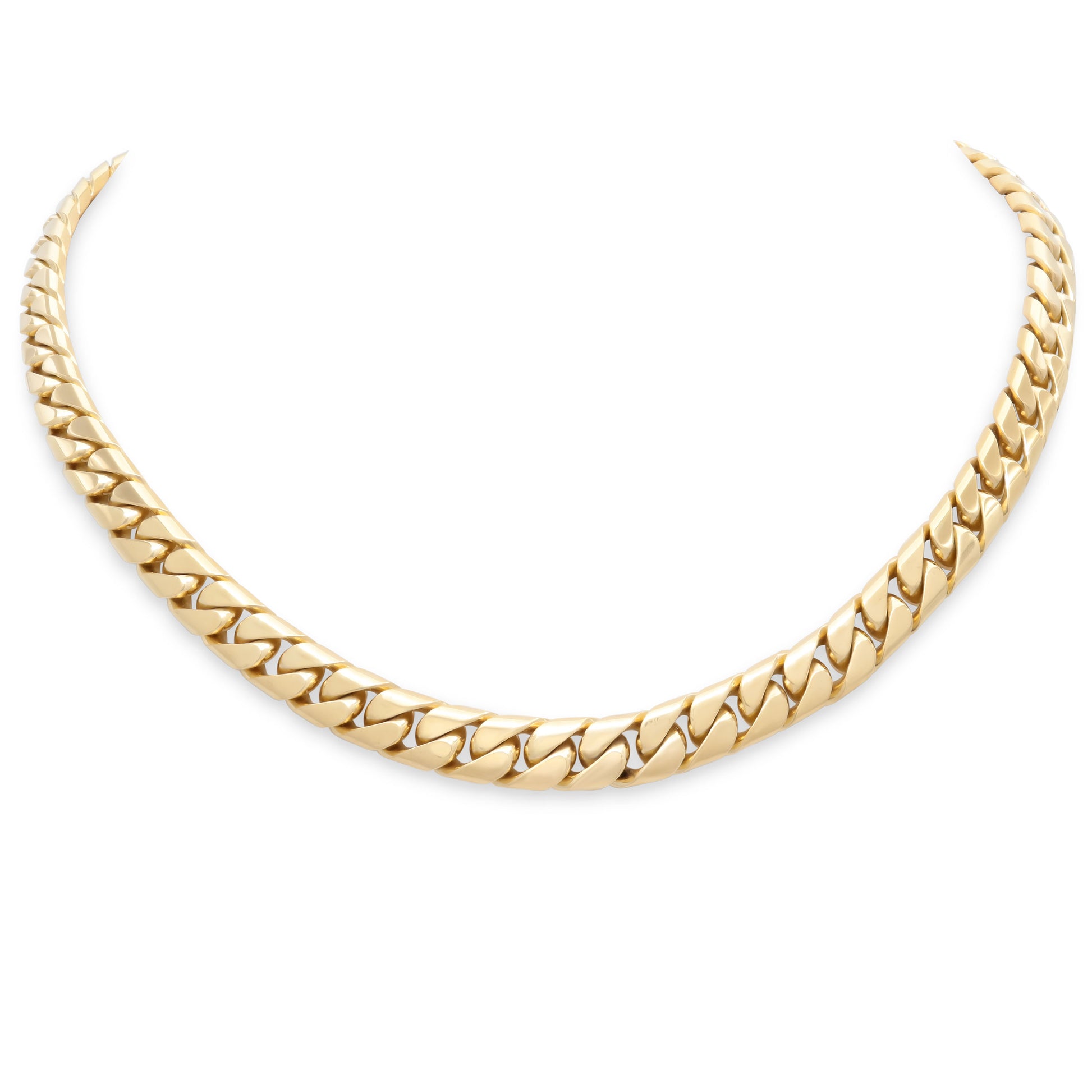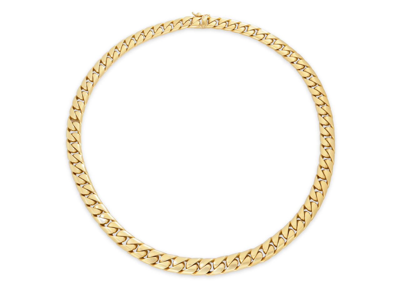 Designed as a graduating line of 69 curb links, in solid 18k yellow gold. With tongue clasp and additional figure of eight safety.