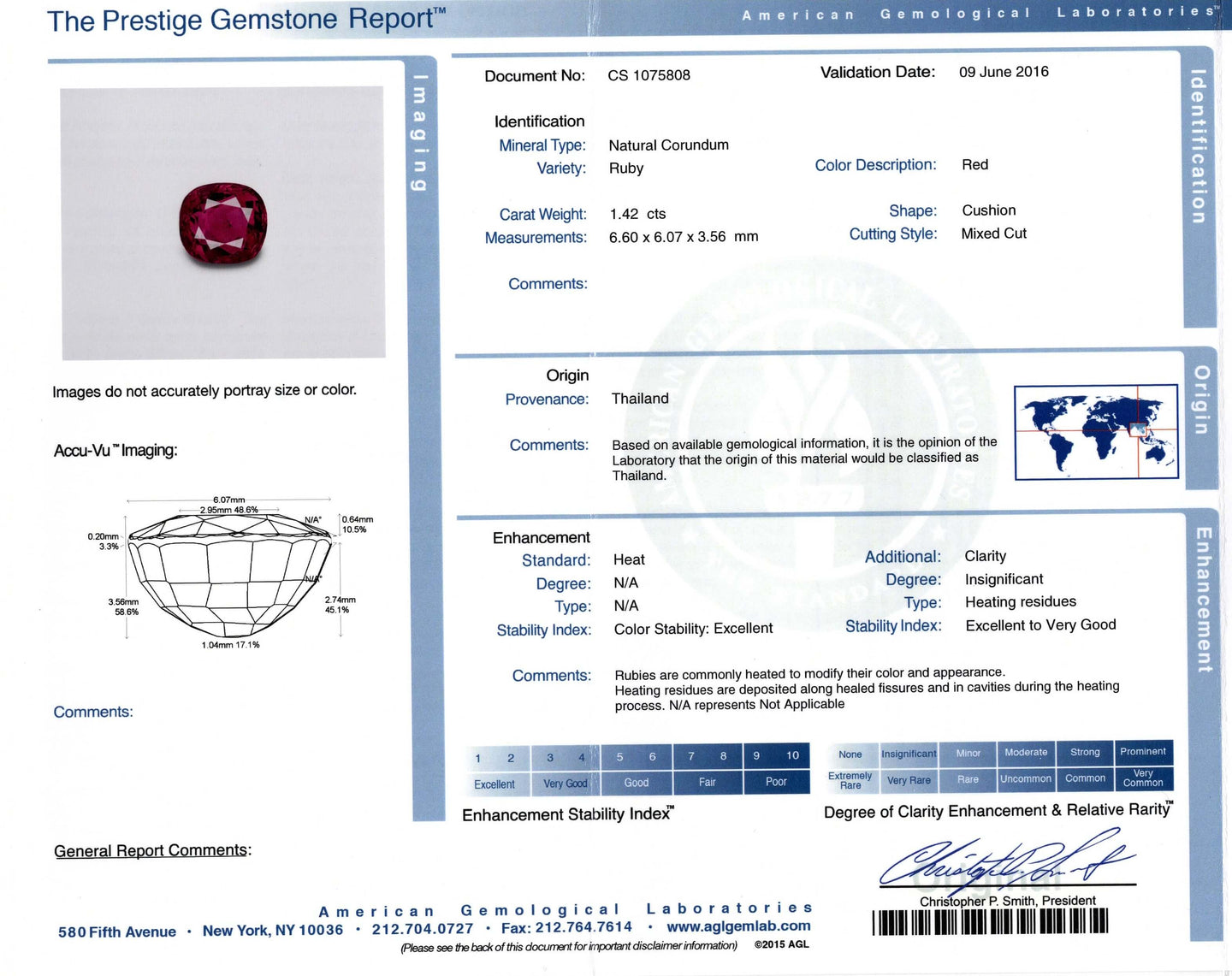 - Gem Stone: Ruby 1.41 carats Cushion cut AGL CS 1075808