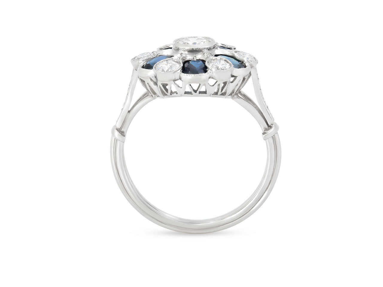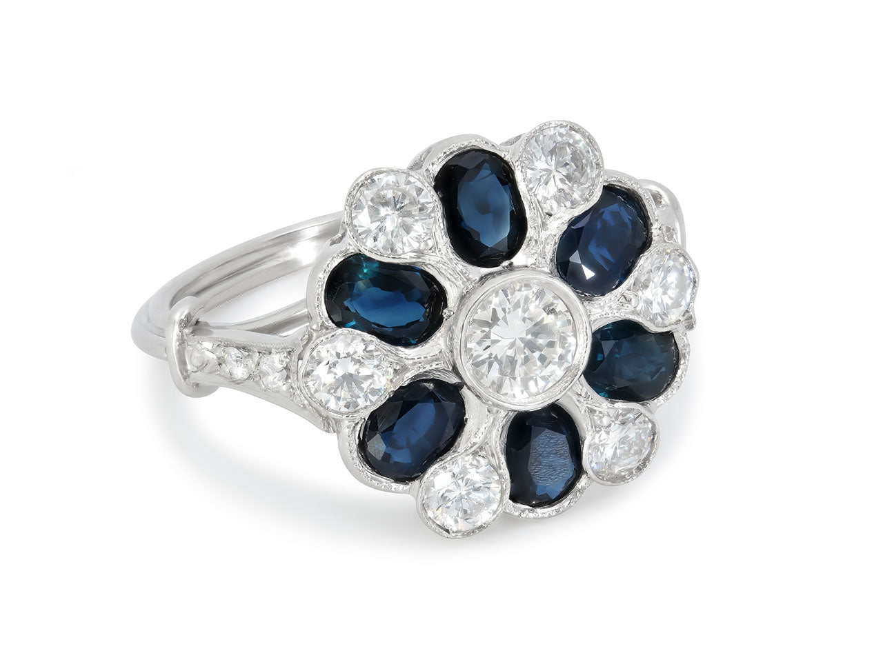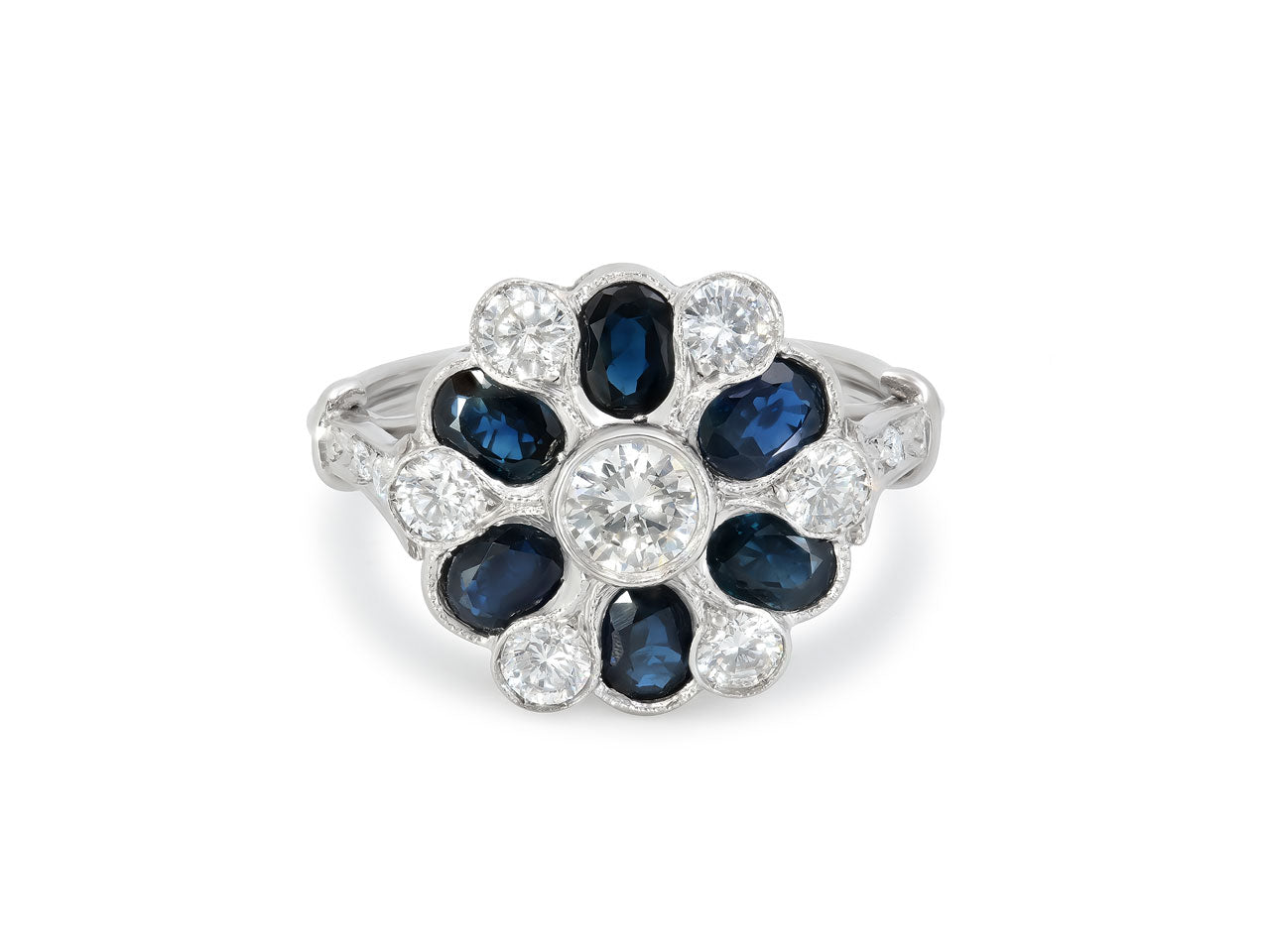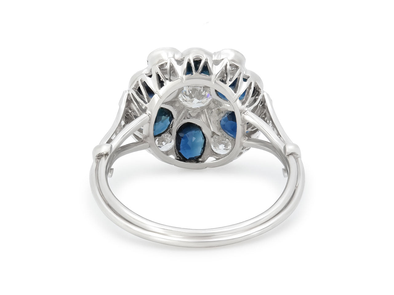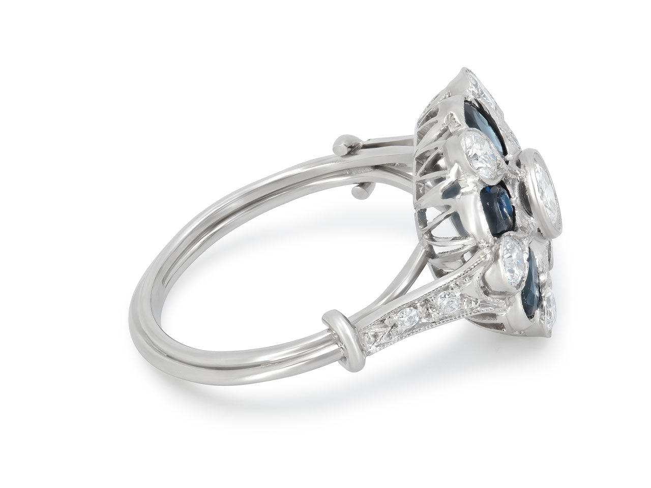 The flower motif ring top centering upon a round brilliant diamond pistil within alternating round diamonds and oval sapphire petals, each shoulder set with a pair of diamonds, in millegrain detailed platinum.