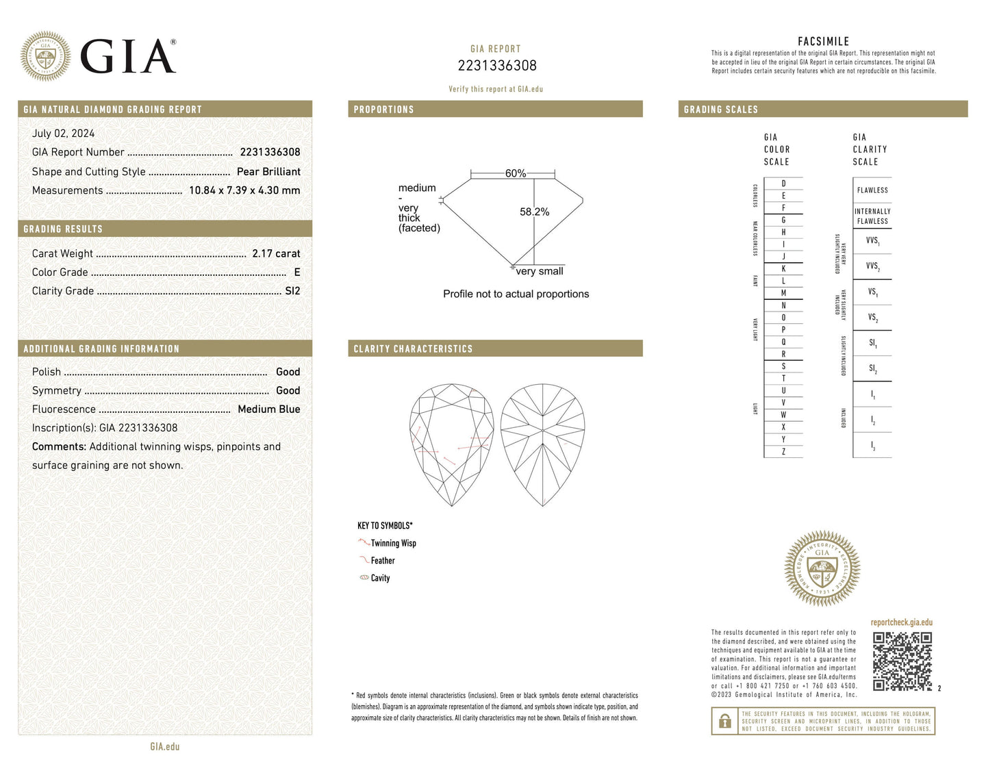 - Gem Stone: Diamond 2.17 carats Pear cut E/SI2 GIA Report No. 2231336308