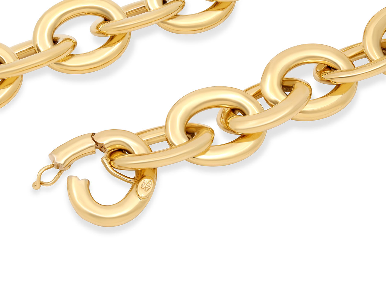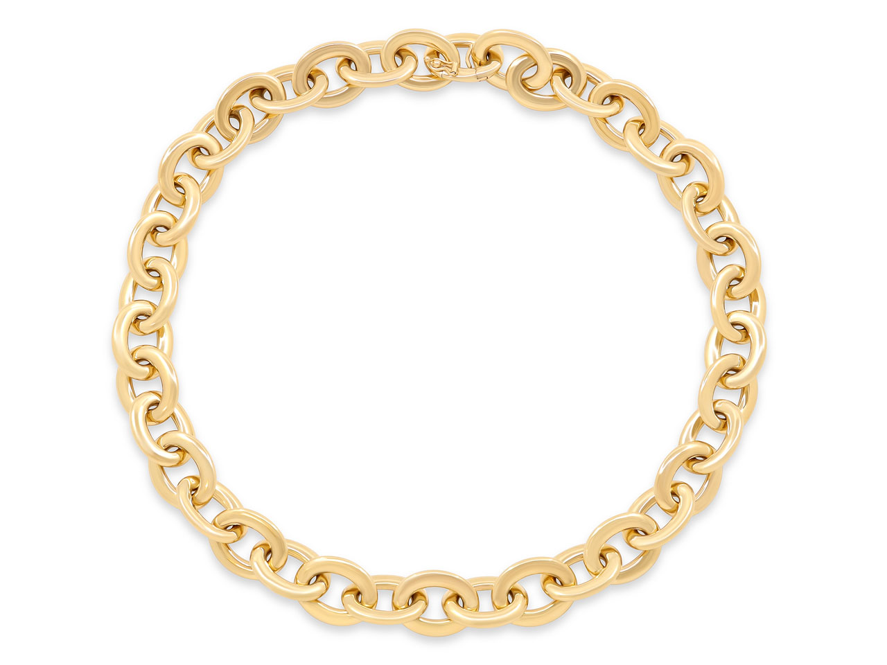 The necklace composed of 40 flattened oval links, in high polish 18k yellow gold. Made by hand in Italy, for Beladora.