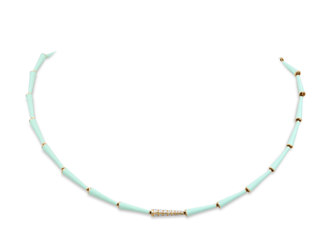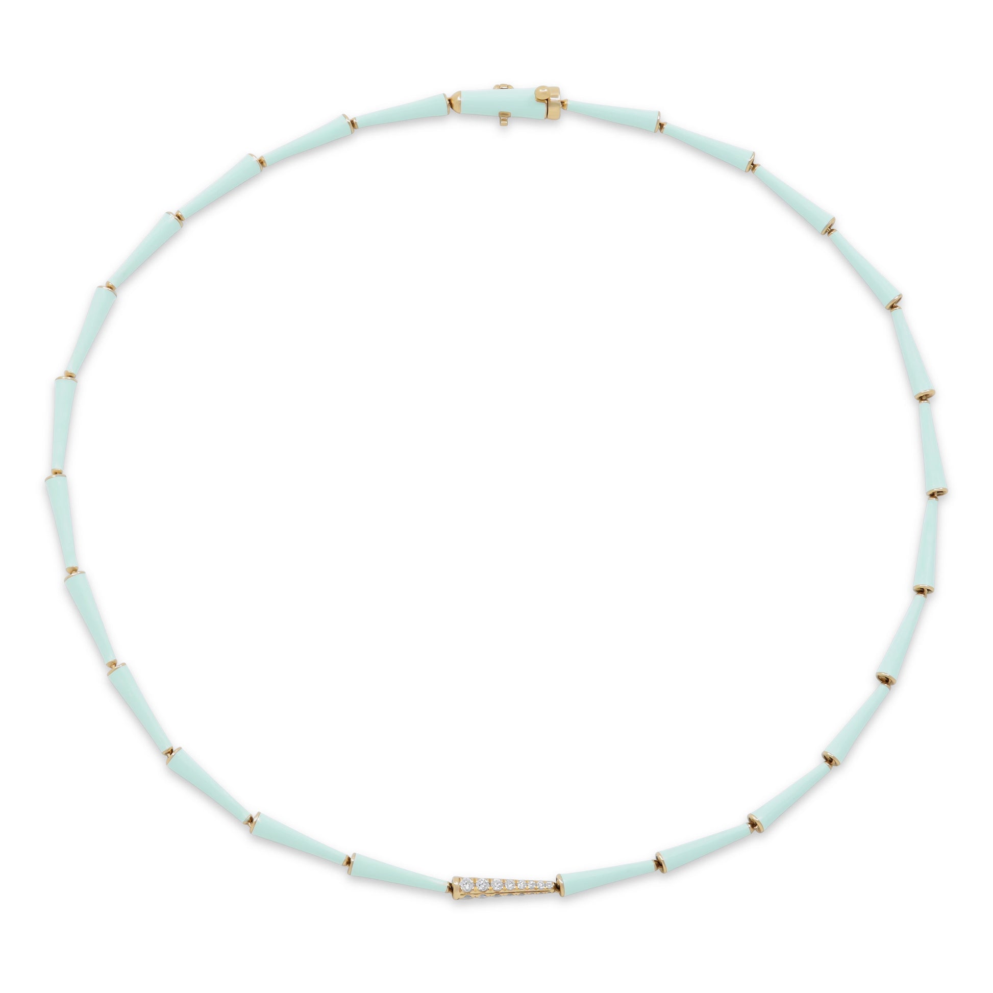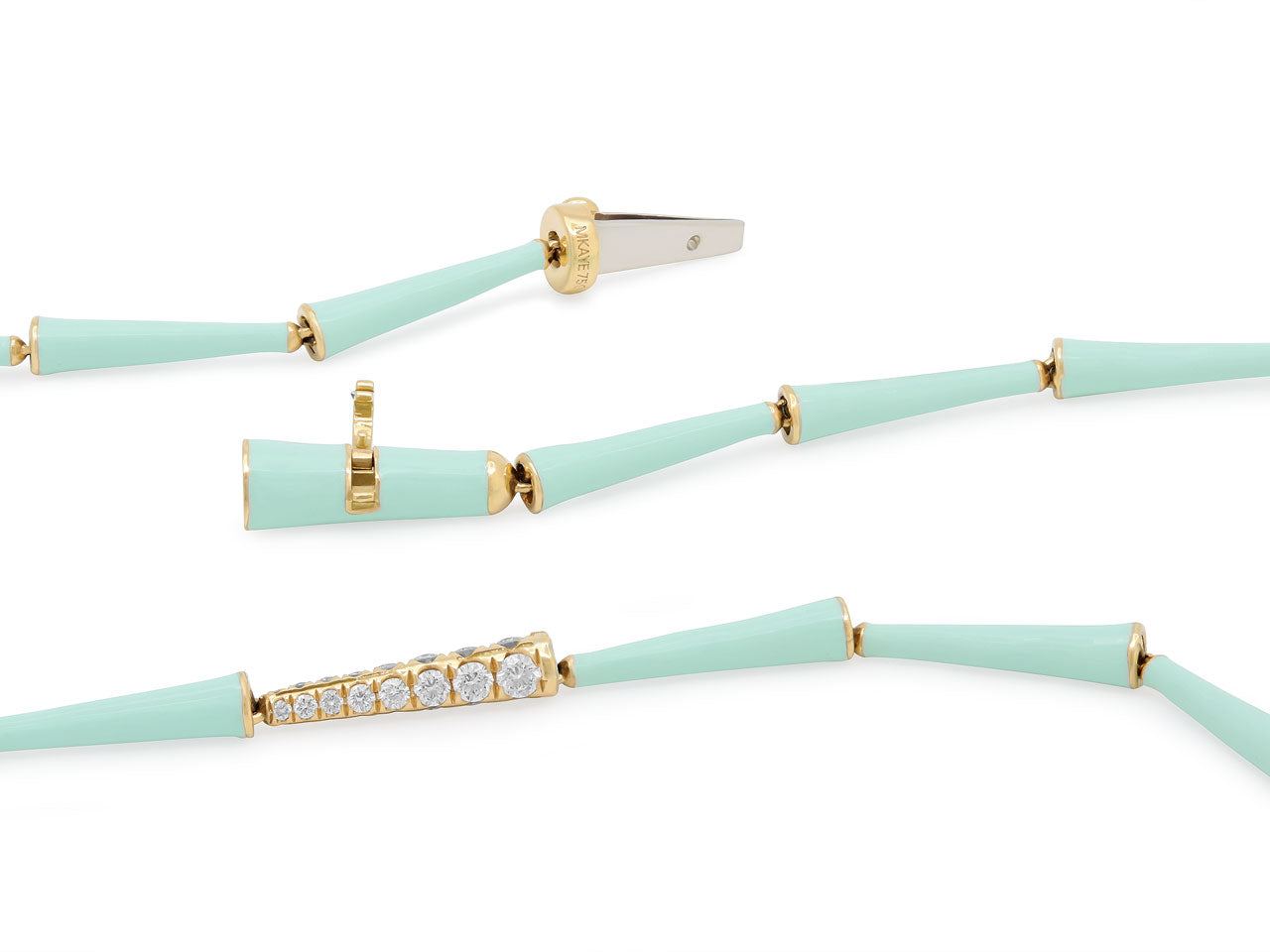 Composed of pastel blue enamel conical links, with one pavé diamond set link, in 18k gold. Signed M Kaye for Melissa Kaye.