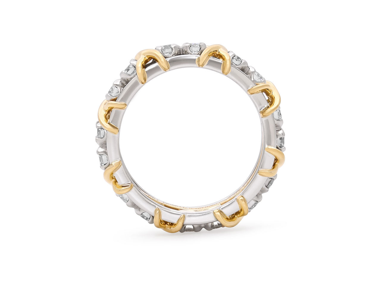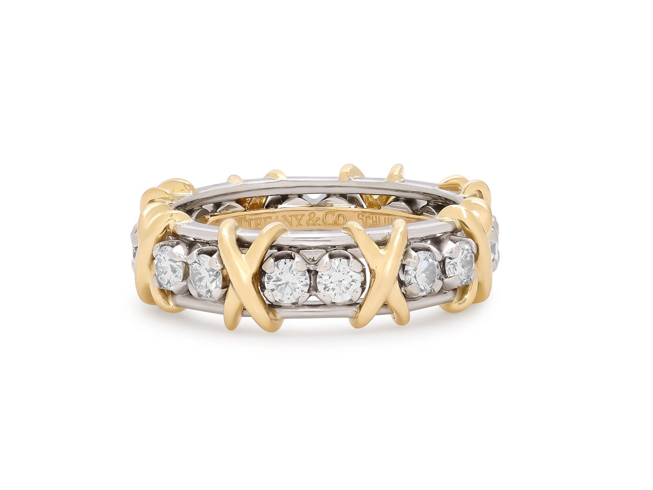 The platinum band set with 8 pairs of round brilliant cut diamonds, inter-spaced by eight 18k yellow gold 'X' motifs. Signed Tiffany & Co., Schlumberger Studios.