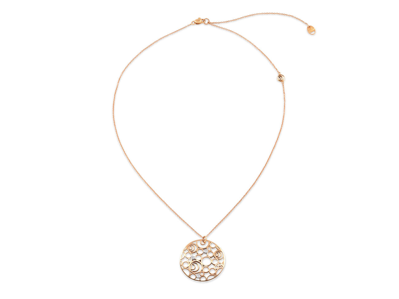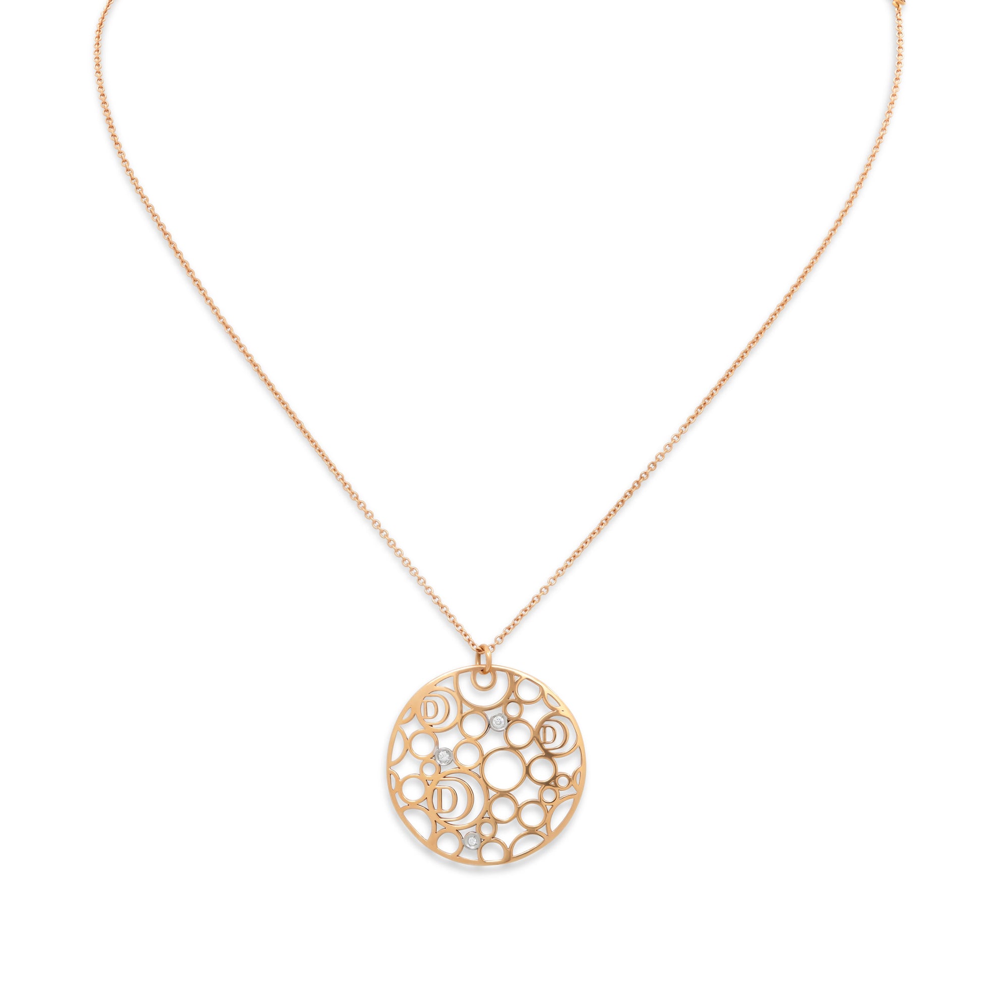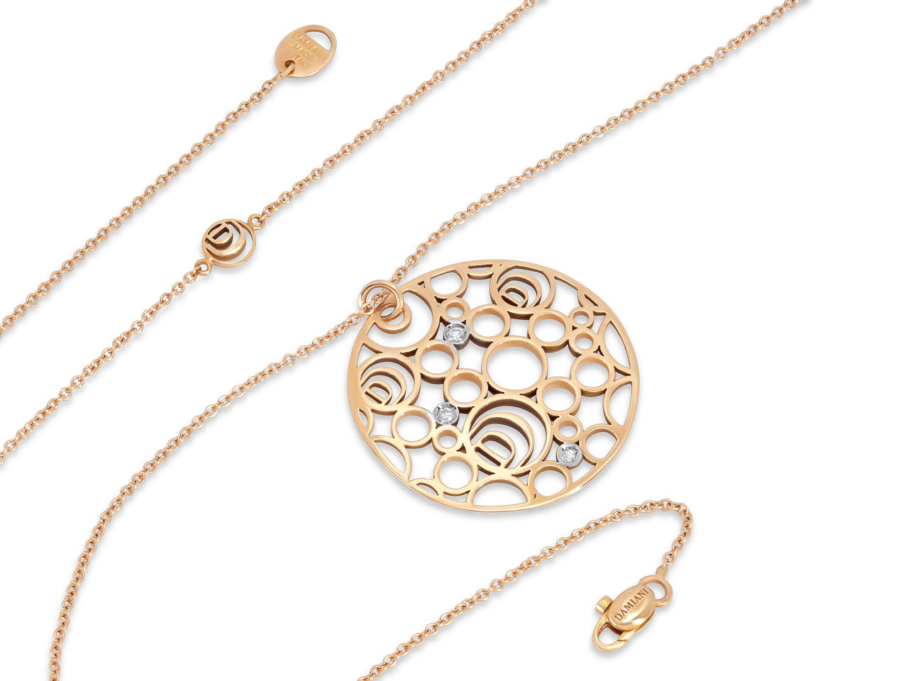 The 18k rose gold openwork pendant containing multi-sized circles motifs, accented with the letter 'D' and three bezel-set round diamonds in 18k white gold, to the fine link rose gold chain. Signed Damiani, with Italian hallmarks.