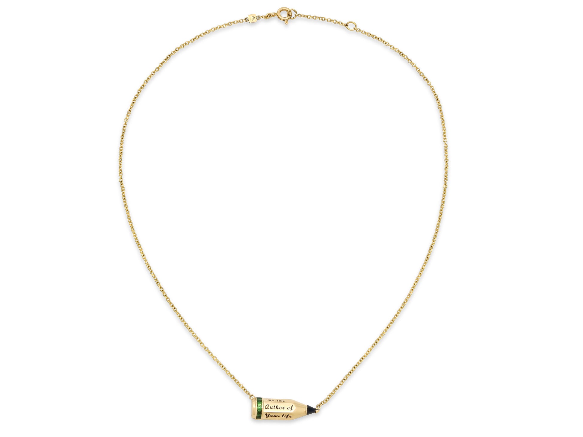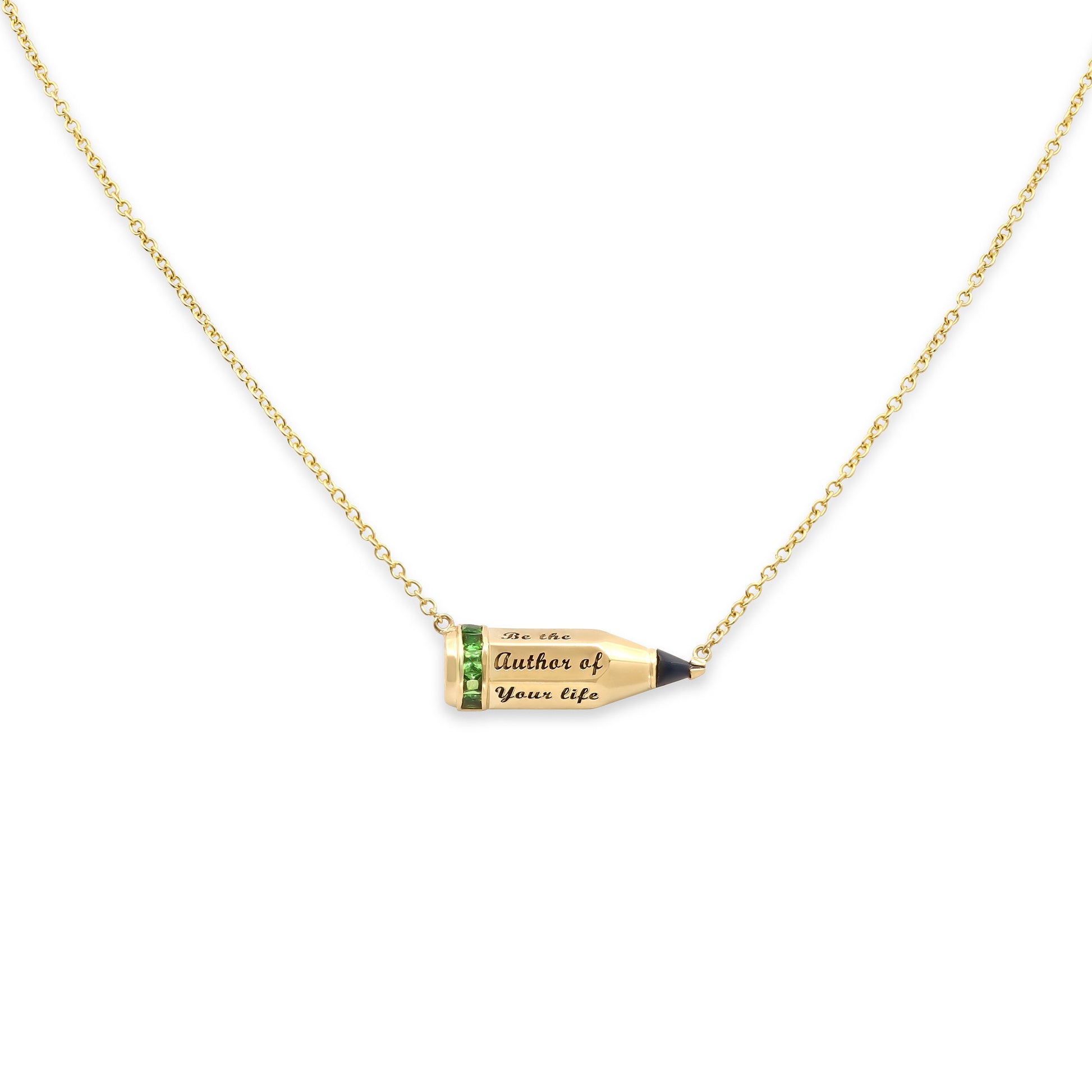 The pendant of pencil motif, with channel-set square tsavorites and a black sapphire tip, suspended from a fine link chain, all in 18k yellow gold. Engraved with the phrase 'Be the Author of Your life' in black enamel, with Sally Son hallmarks.