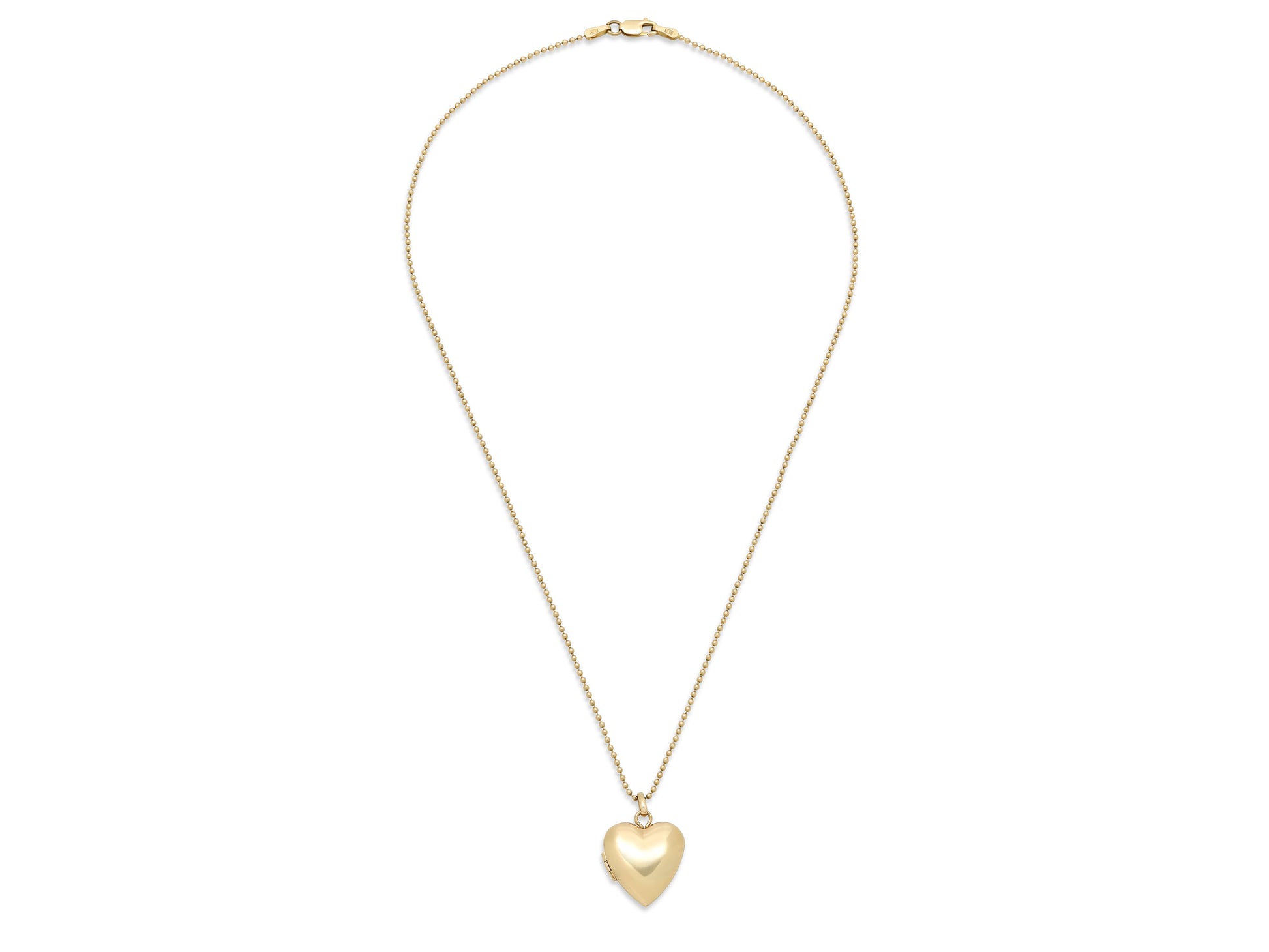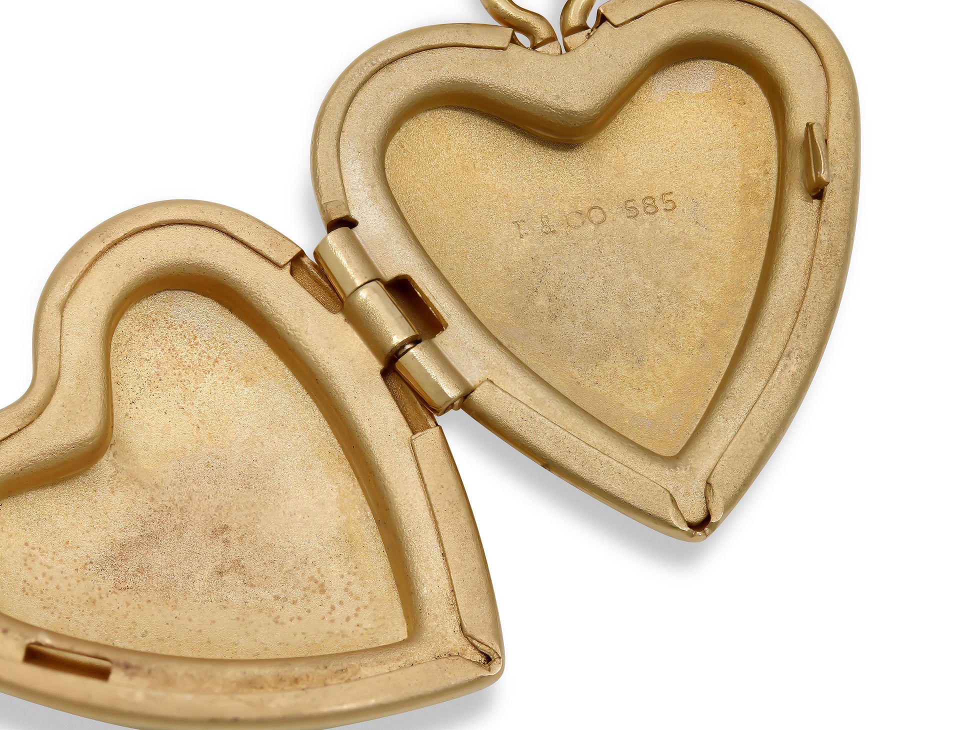 The heart locket in high polish, opening to reveal to brushed finish compartments, all 14k yellow gold. Signed T & Co.