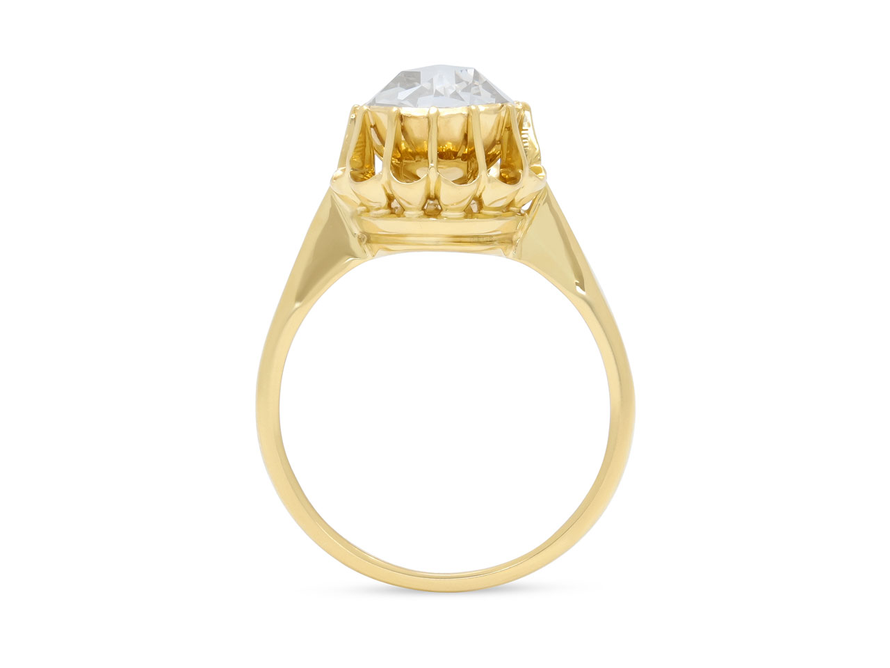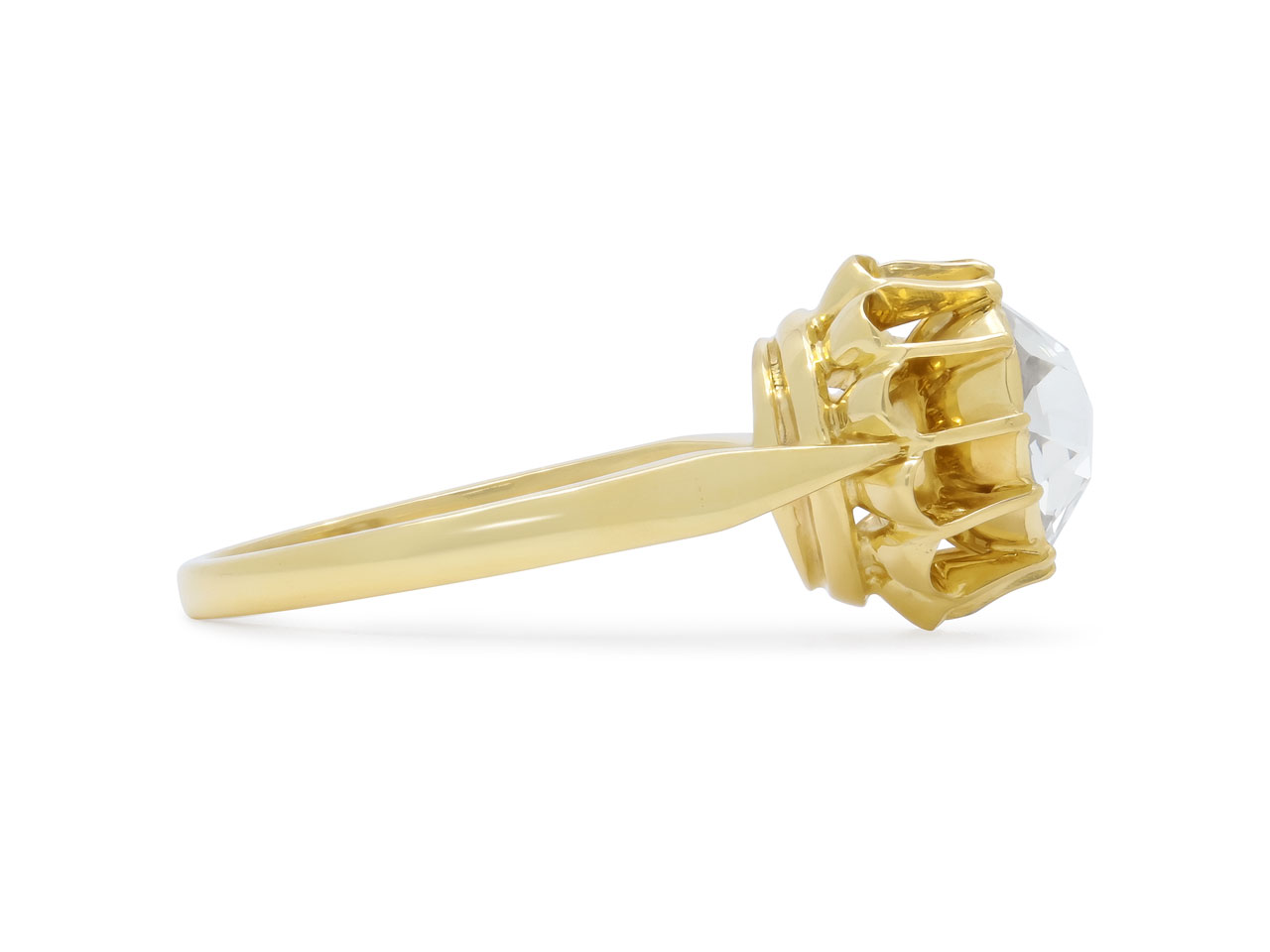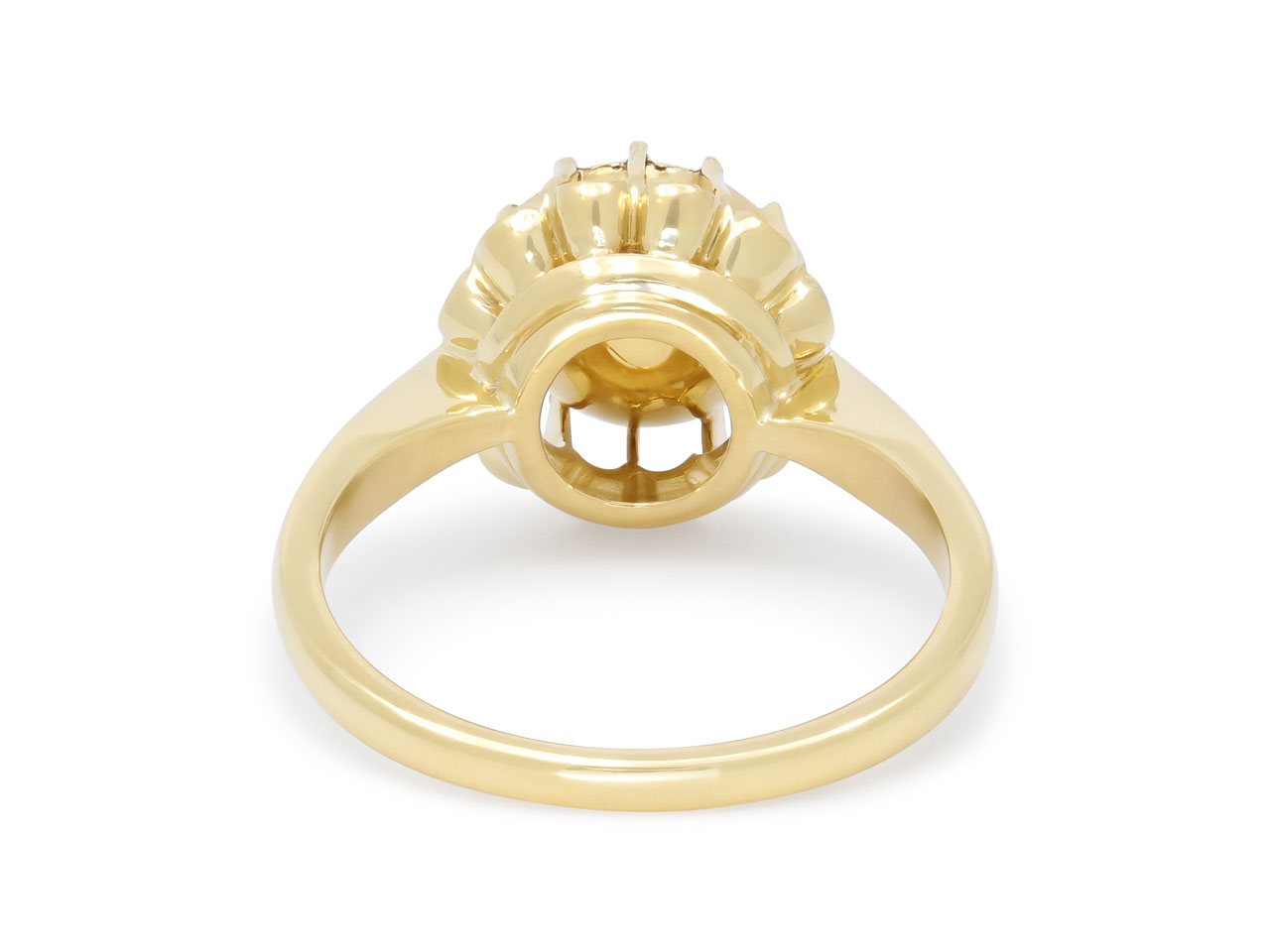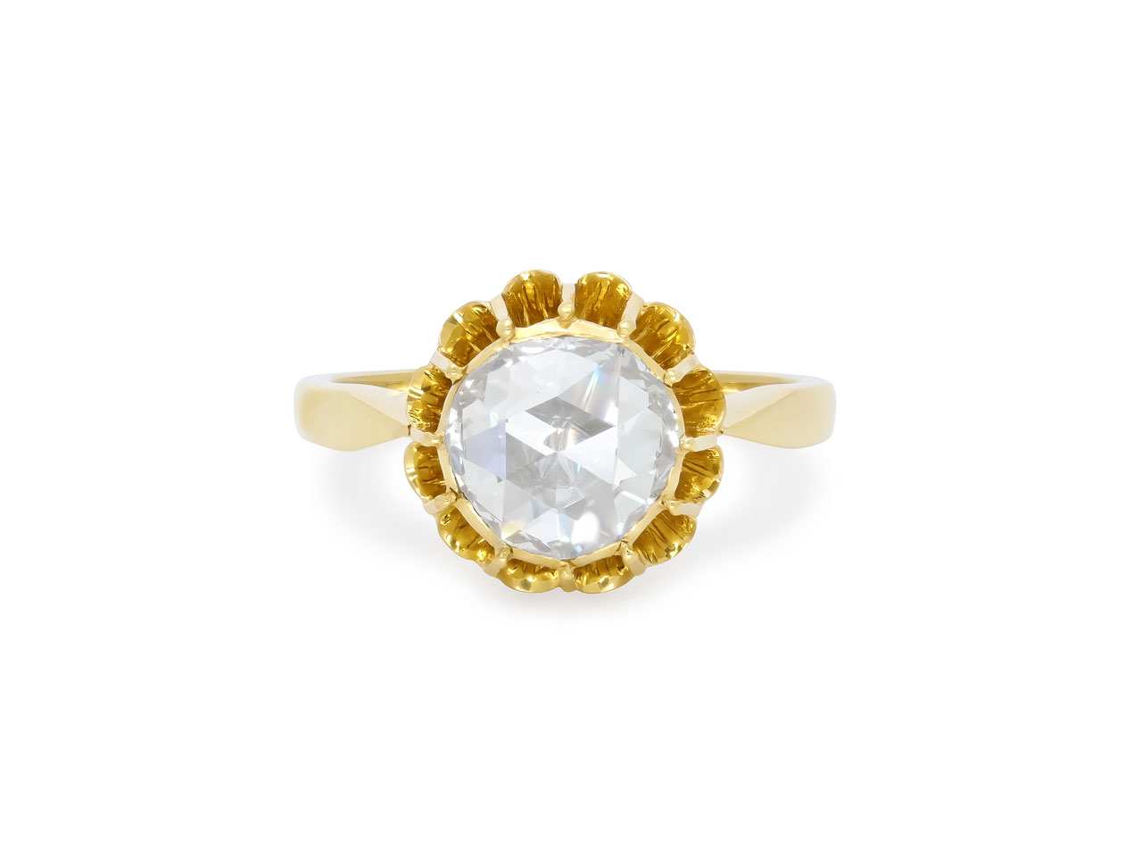 The rose-cut diamond in a foiled closed-back setting, within a buttercup setting, in 18k yellow gold.
