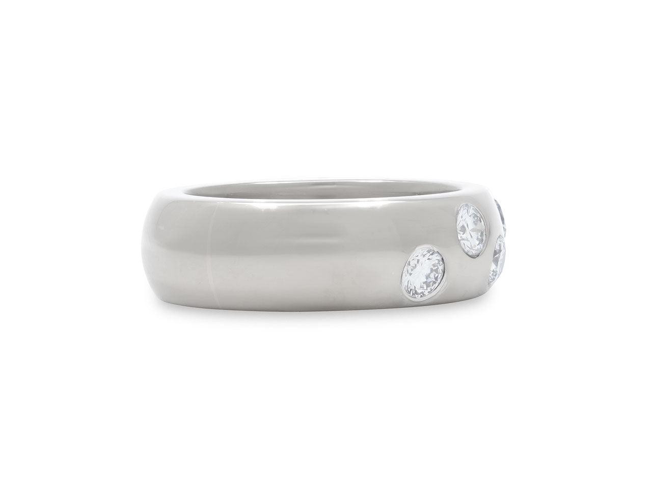 The high polish, domed band top with flush-set diamonds set on alternating edges, in 18k white gold.